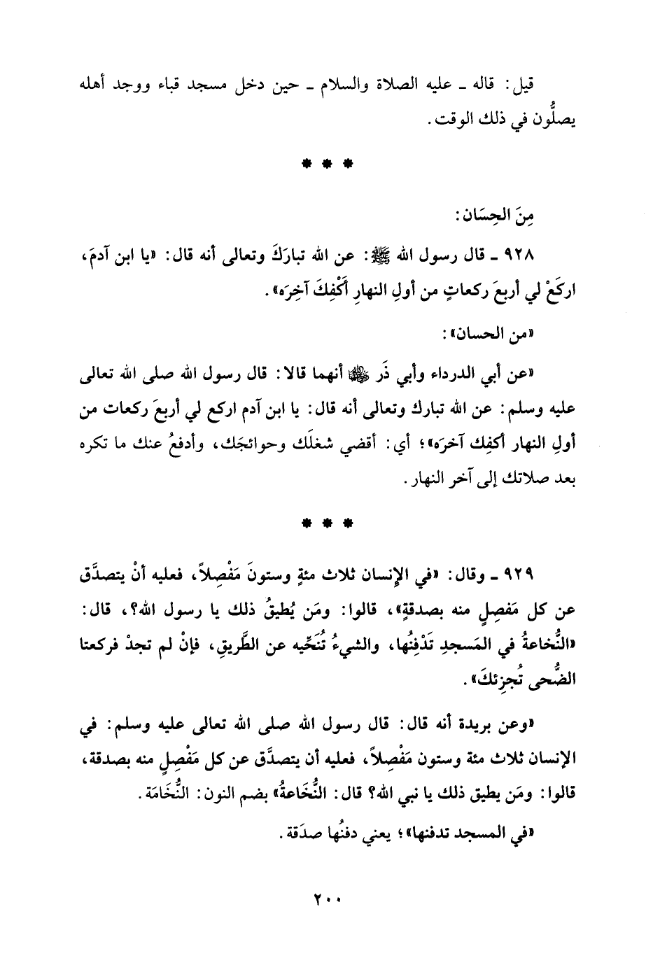929 - وقال: "في الإنسان ثلاث مئةٍ وستونَ مَفْصِلًا، فعليه أنْ يتصدَّق عن كل مَفصِل منه بصدقةٍ"، قالوا: ومَن يُطيقُ ذلك يا رسول الله؟، قال: "النُّخاعةُ في المَسجدِ تَدْفِنُها، والشيءُ تُنَحِّيه عن الطَّريقِ، فإنْ لم تجدْ فركعتا الضُّحى تُجزِئكَ".