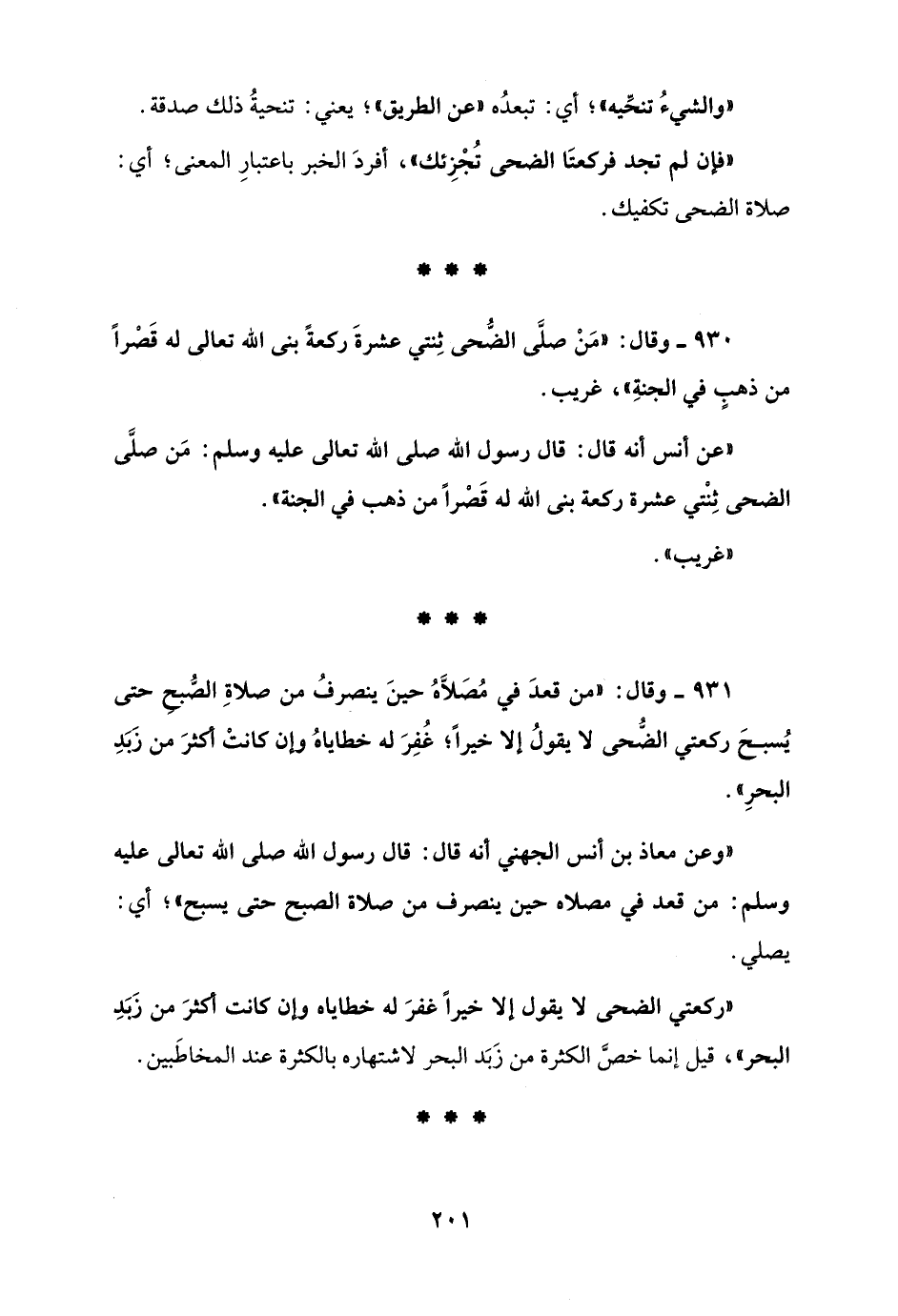 930 - وقال: "مَنْ صلَّى الضُّحى ثِنتي عشرةَ ركعةً بنى الله تعالى له قَصْرًا من ذهبٍ في الجنةِ"، غريب.