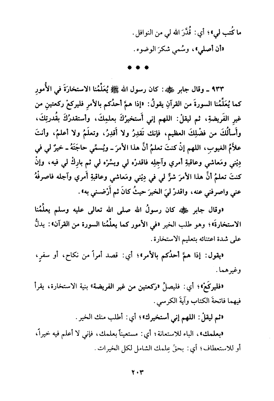 933 - وقال جابر - رضي الله عنه -: كان رسول الله - صلى الله عليه وسلم - يُعَلّمُنا الاستخارَةَ في الأُمورِ كما يُعَلِّمُنا السورةَ من القرآنِ يقولُ: "إذا همَّ أحدُكم بالأمرِ فليركعْ ركعتينِ من غيرِ الفَريضةِ، ثم ليقلْ: اللهم إني أَستخيرُكَ بعلمِكَ، وأستقدرُكَ بقُدرتِكَ، وأَسألُكَ من فضْلِكَ العظيمِ، فإنك تَقدِرُ ولا أَقدِرُ، وتعلَمُ ولا أعلمُ، وأنتَ علَّامُ الغيوبِ، اللهم إنْ كنتَ تعلمُ أنَّ هذا الأمرَ - ويُسمِّي حاجَتَهُ - خيرٌ لي في دِيْني ومَعاشي وعاقبةِ أمري وآجِلِه فاقدرْه لي ويسِّرْه لي ثم بارِكْ لي فيه، وإنْ كنتَ تعلمُ أنَّ هذا الأمرَ شرٌّ لي في دِيْني ومَعاشي وعاقبةِ أَمري وآجله فاصرفْهُ عني واصرفني عنه، واقدرْ ليَ الخيرَ حيثُ كانَ ثم أَرْضني به".