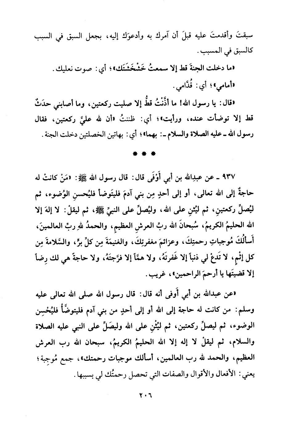 937 - عن عبدِ الله بن أبي أَوْفَى قال: قال رسول الله - صلى الله عليه وسلم -: "مَنْ كانتْ له حاجةٌ إلى الله تعالى، أو إلى أحدٍ مِن بني آدمَ فليتَوضأ فليُحسنِ الوُضوء، ثم ليُصلِّ ركعتينِ، ثم ليُثنِ على الله، وليُصلِّ على النبيِّ - صلى الله عليه وسلم -، ثم ليقلْ: لا إلهَ إلا الله الحليمُ الكريمُ، سُبحانَ الله ربِّ العرشِ العظيم، والحمدُ للهِ ربِّ العالمينَ، أَسألُكَ مُوجباتِ رحمتِكَ، وعزائمَ مغفرتِكَ، والغنيمَةَ مِن كلِّ برٍّ، والسَّلامةَ مِن كل إثْمٍ، لا تَدعْ لي ذنبًا إلا غَفرتَهُ، ولا همًّا إلا فرَّجتَهُ، ولا حاجةً هي لك رِضًا إلا قضيتَها يا أرحمَ الراحمين"، غريب.