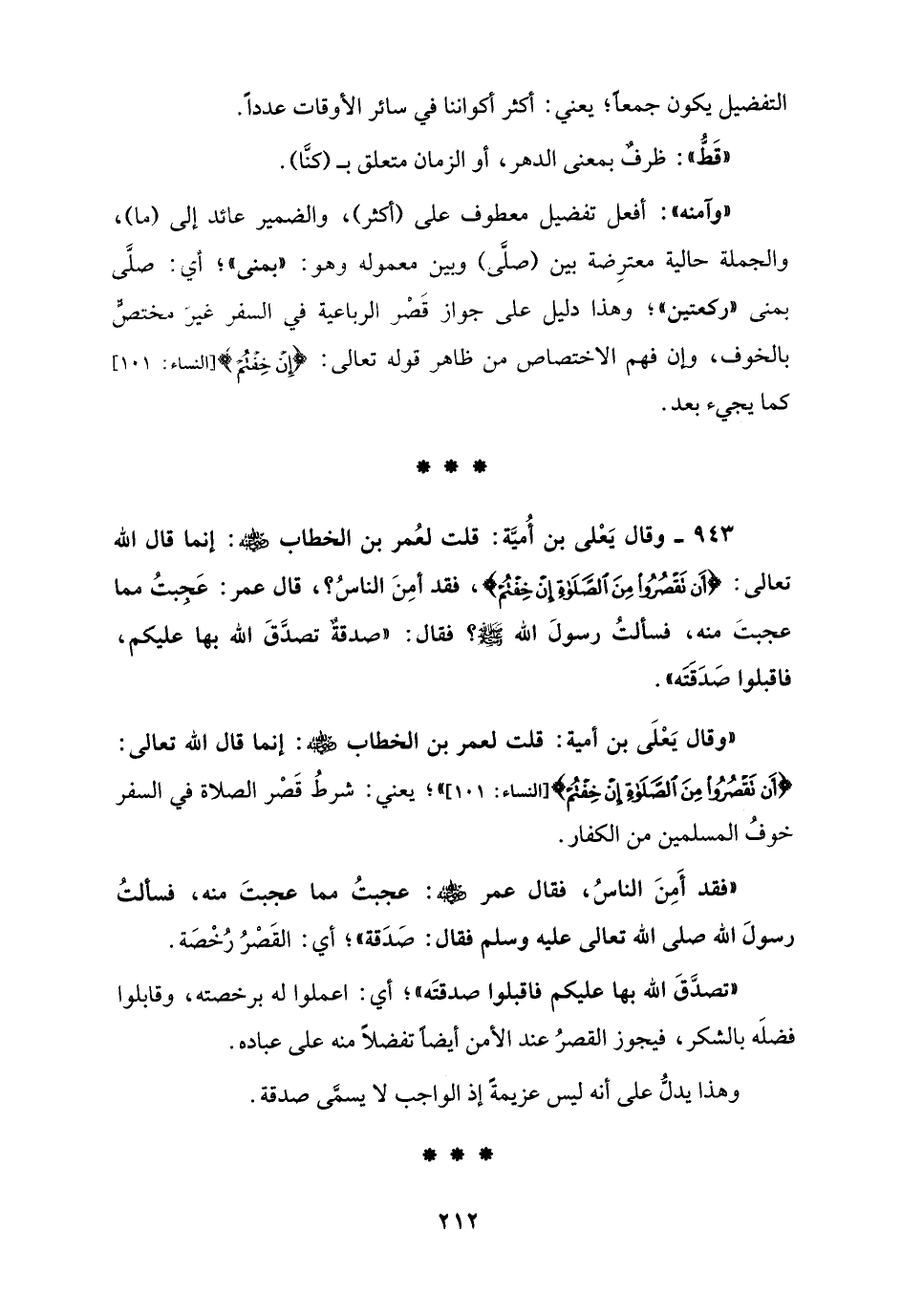 943 - وقال يَعْلى بن أُميَّة: قلت لعُمر بن الخطاب - رضي الله عنه -: إنما قال الله تعالى: {أَنْ تَقْصُرُوا مِنَ الصَّلَاةِ إِنْ خِفْتُمْ}، فقد أمِنَ الناسُ؟، قال عمر: عَجِبتُ مما عجبتَ منه، فسألتُ رسولَ الله - صلى الله عليه وسلم -؟ فقال: "صدقةٌ تصدَّقَ الله بها عليكم، فاقبلوا صَدَقتَه".