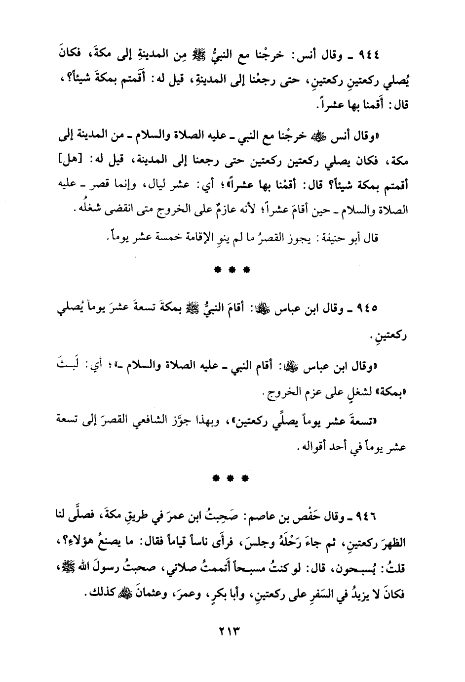 "تسعةَ عشر يومًا يصلِّي ركعتين"، وبهذا جوَّز الشافعي القصرَ إلى تسعة عشر يومًا في أحد أقواله.