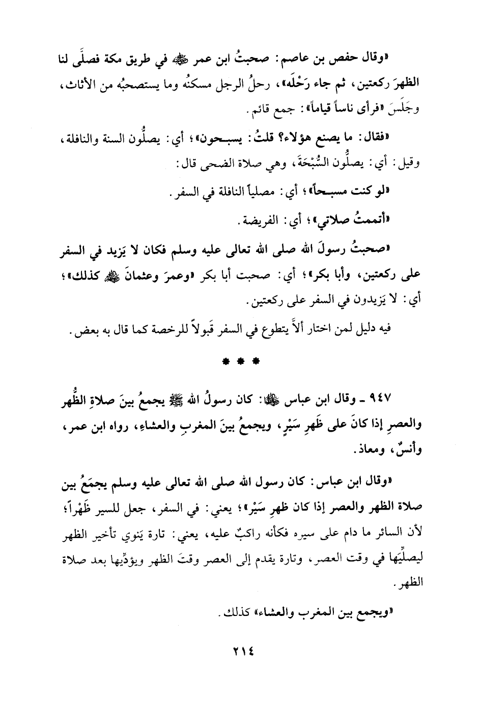 947 - وقال ابن عباس - رضي الله عنهما -: كان رسولُ الله - صلى الله عليه وسلم - يجمعُ بينَ صلاةِ الظُّهر والعصرِ إذا كانَ على ظَهرِ سَيْرٍ، ويجمعُ بينَ المغربِ والعشاءِ، رواه ابن عمر، وأنسٌ، ومعاذ.