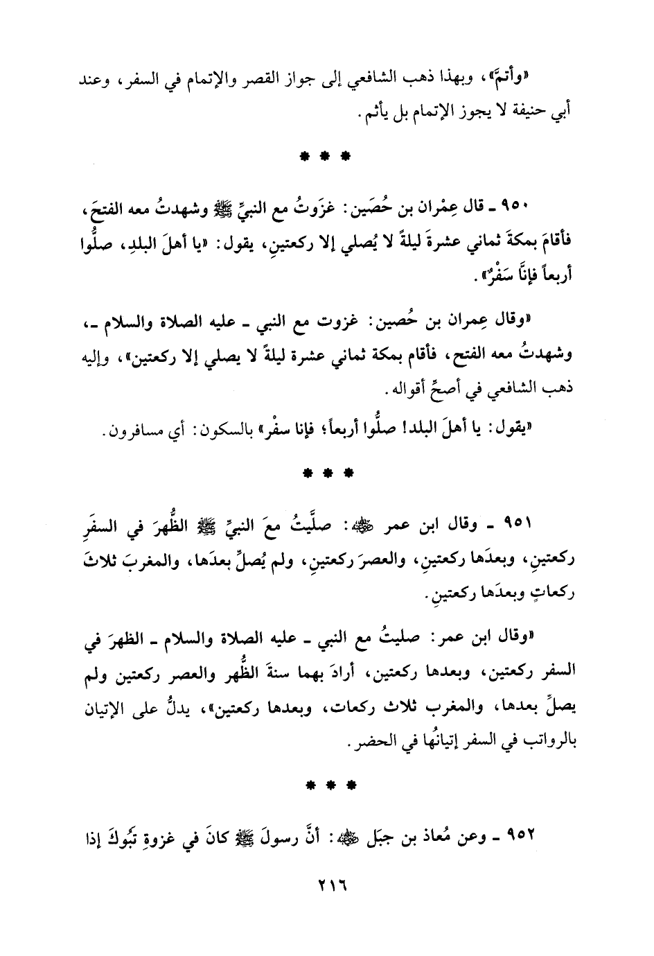 950 - قال عِمْران بن حُصَين: غزَوتُ مع النبيِّ - صلى الله عليه وسلم - وشهدتُ معه الفتحَ، فأقامَ بمكةَ ثماني عشرةَ ليلةً لا يُصلي إلا ركعتينِ، يقول: "يا أهلَ البلدِ، صلُّوا أربعًا فإنَّا سَفْرٌ".