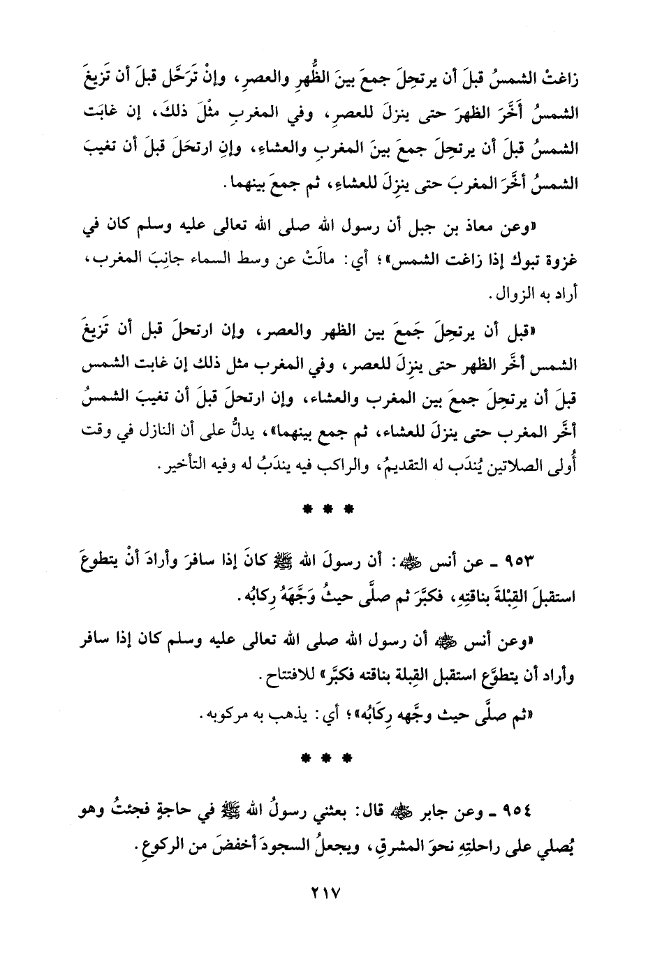 953 - عن أنس - رضي الله عنه -: أن رسولَ الله - صلى الله عليه وسلم - كانَ إذا سافرَ وأرادَ أنْ يتطوعَ استقبلَ القِبْلةَ بناقتِهِ، فكبَّرَ ثم صلَّى حيثُ وَجَّهَهُ رِكابُه.