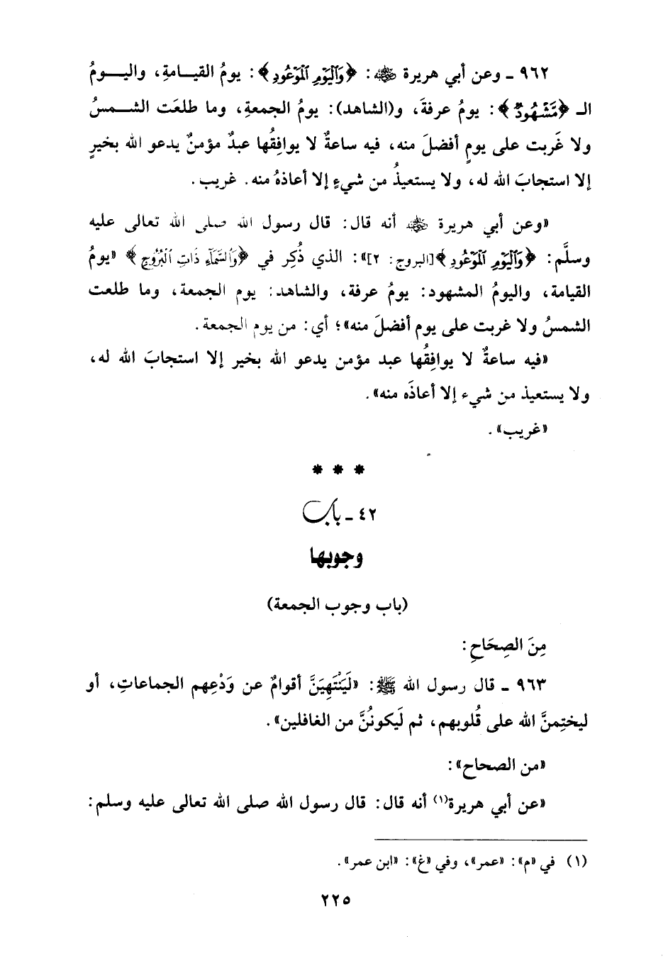 962 - وعن أبي هريرة - رضي الله عنه -: {وَالْيَوْمِ الْمَوْعُودِ}: يومُ القيامةِ، واليومُ التي {مَشْهُودٍ}: يومُ عرفةَ، و (الشاهد): يومُ الجمعةِ، وما طلعَت الشمسُ ولا غَربت على يومٍ أفضلَ منه، فيه ساعةٌ لا يوافِقُها عبدٌ مؤمنٌ يدعو الله بخيرٍ إلا استجابَ الله له، ولا يستعيذُ من شيءٍ إلا أعاذهُ منه، غريب.