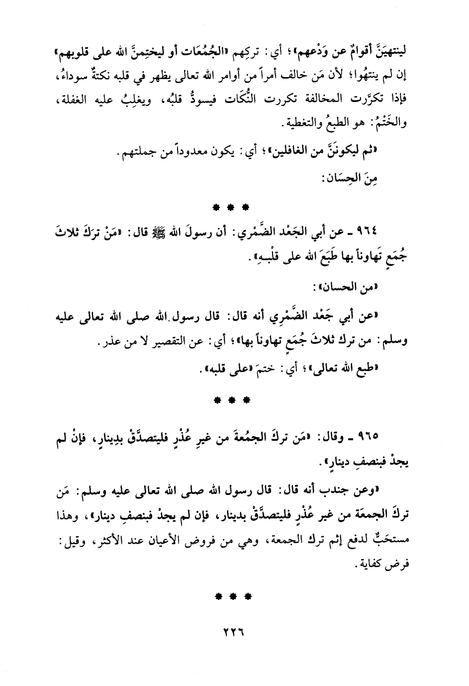964 - عن أبي الجَعْد الضَّمْري: أن رسولَ الله - صلى الله عليه وسلم - قال: "مَنْ ترَكَ ثلاثَ جُمَعٍ تَهاونًا بها طَبَعَ الله على قلْبهِ".