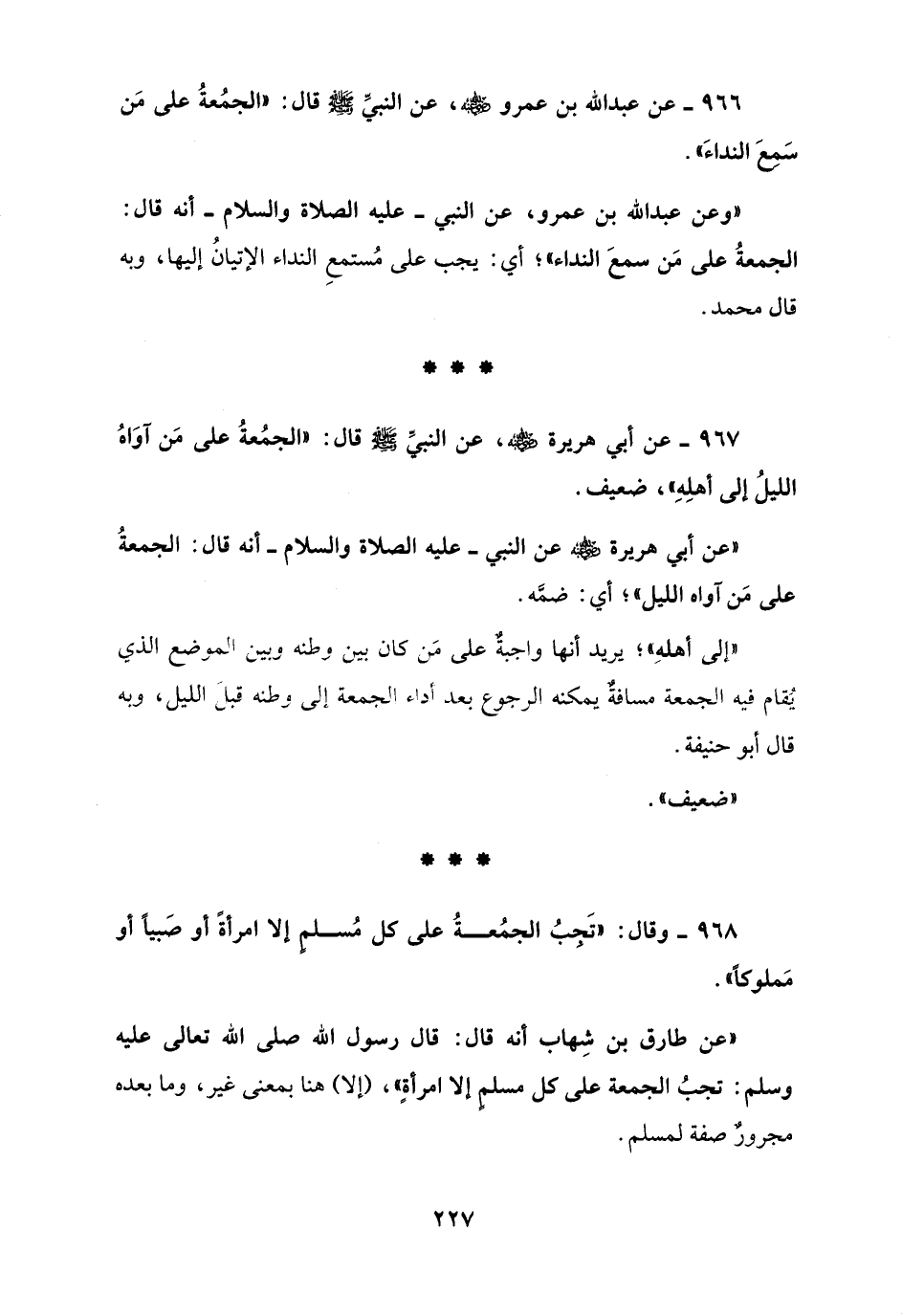 966 - عن عبد الله بن عمرو - رضي الله عنه -، عن النبيِّ - صلى الله عليه وسلم - قال: "الجمُعةُ على مَن سَمعَ النداءَ".