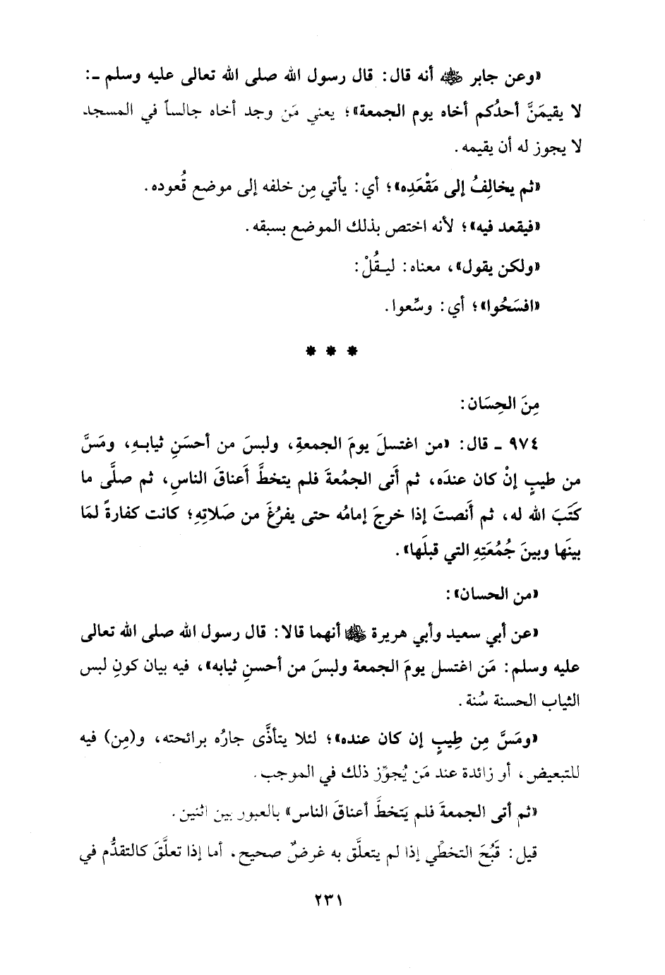 "وعن جابر - رضي الله عنه - أنه قال: قال رسول الله صلى الله تعالى عليه وسلم -: لا يقيمَنَّ أحدُكم أخاه يوم الجمعة"؛ يعني من وجد أخاه جالسًا في المسجد لا يجوز له أن يقيمه.