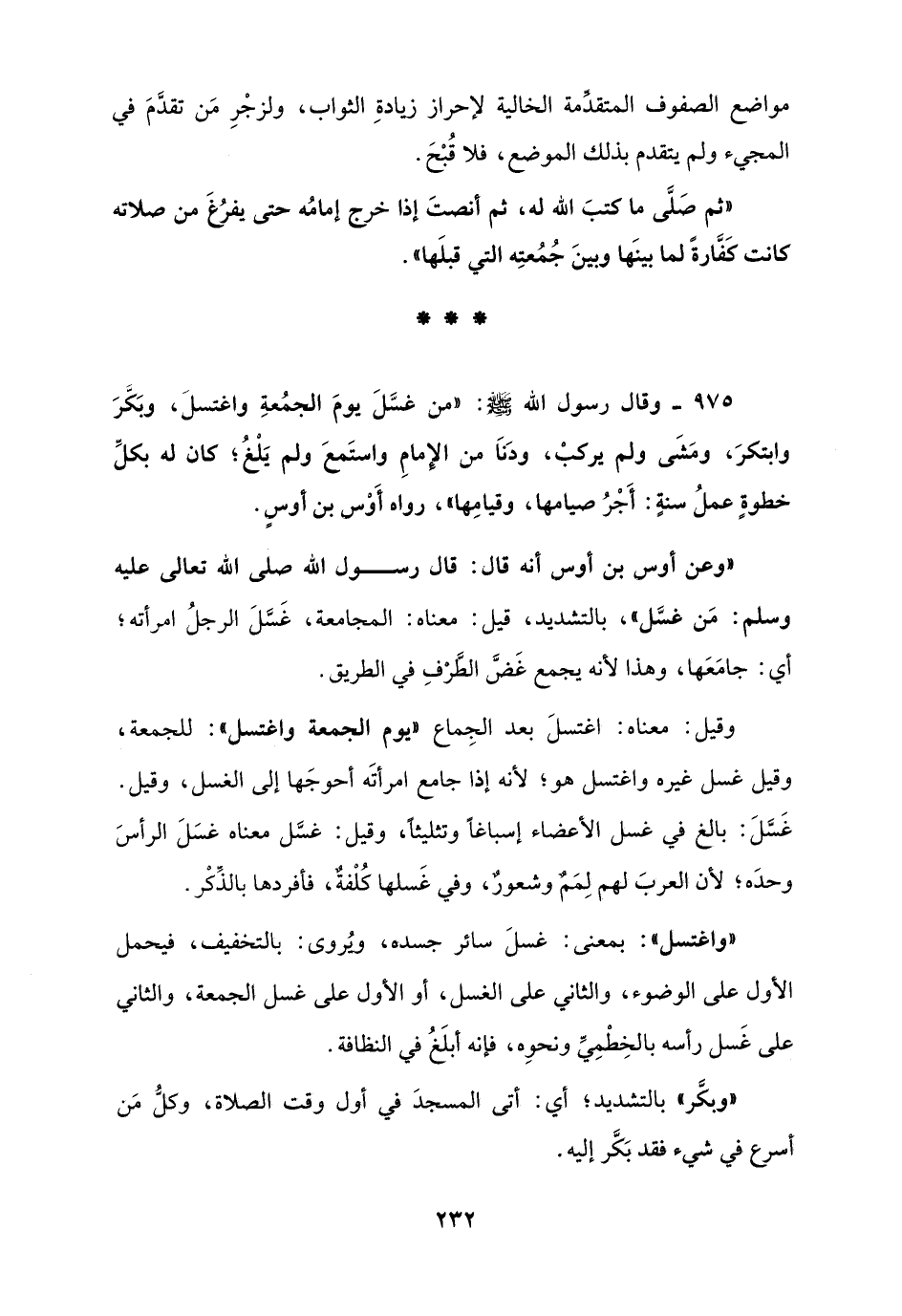 975 - وقال رسول الله - صلى الله عليه وسلم -: "من غسَّلَ يومَ الجمُعةِ واغتسلَ، وبَكَّرَ وابتكرَ، ومَشَى ولم يركبْ، ودَنَا من الإِمامِ واستَمعَ ولم يَلْغُ؛ كان له بكلِّ خطوةٍ عملُ سنةٍ: أَجْرُ صيامها، وقيامِها"، رواه أَوْس بن أوسٍ.