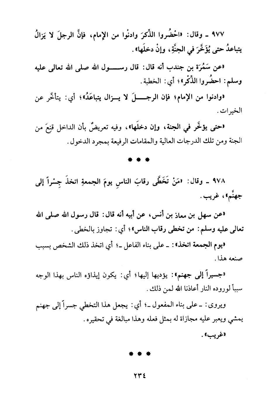 978 - وقال: "مَنْ تَخَطَّى رقابَ الناسِ يومَ الجمعةِ اتخذَ جِسْرًا إلى جهنَّم"، غريب.