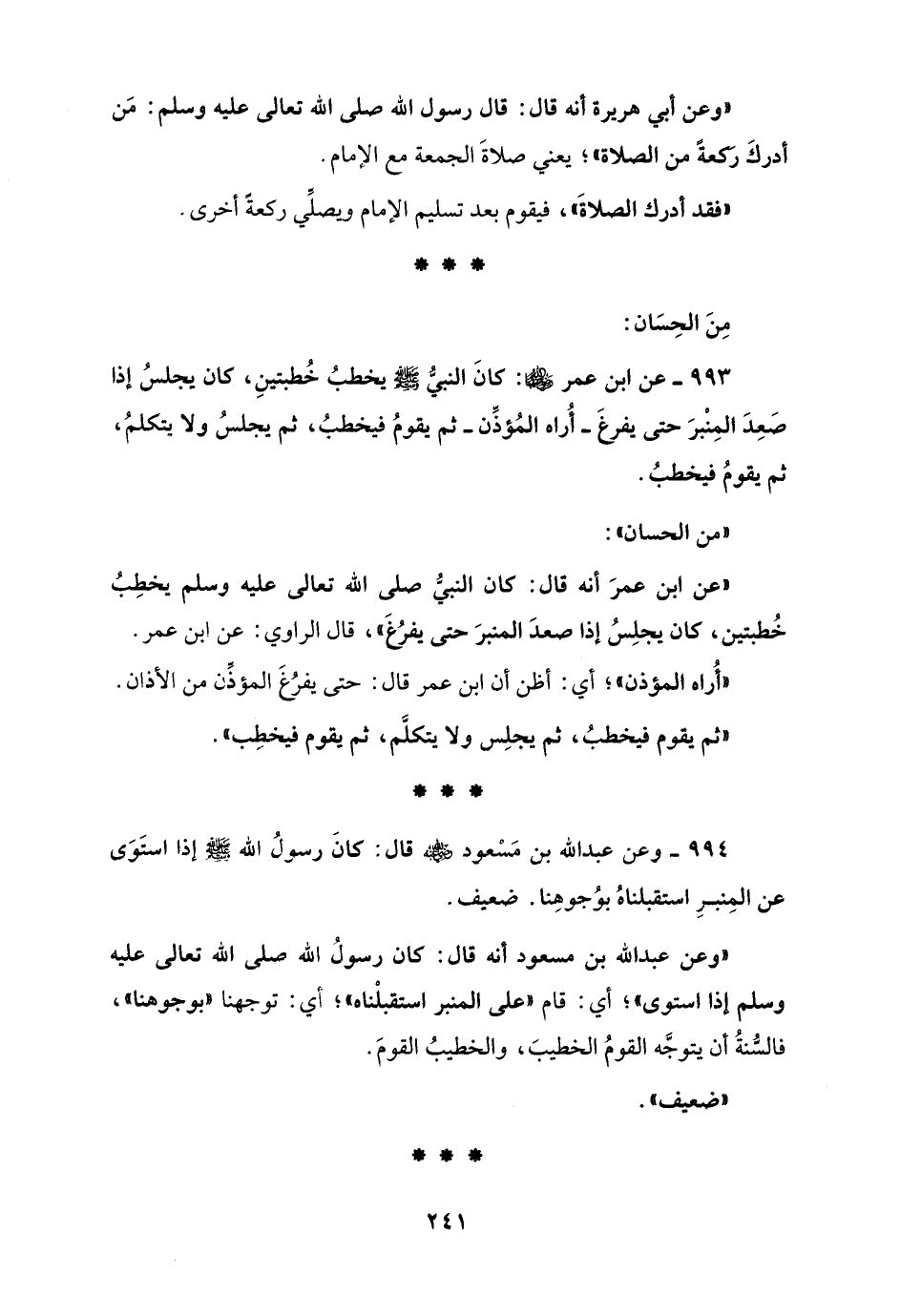 993 - عن ابن عمر - رضي الله عنه -: كانَ النبيُّ - صلى الله عليه وسلم - يخطبُ خُطبتينِ، كان يجلسُ إذا صَعِدَ المِنْبرَ حتى يفرغَ - أُراه المُؤذِّن - ثم يقومُ فيخطبُ، ثم يجلسُ ولا يتكلمُ، ثم يقومُ فيخطبُ.