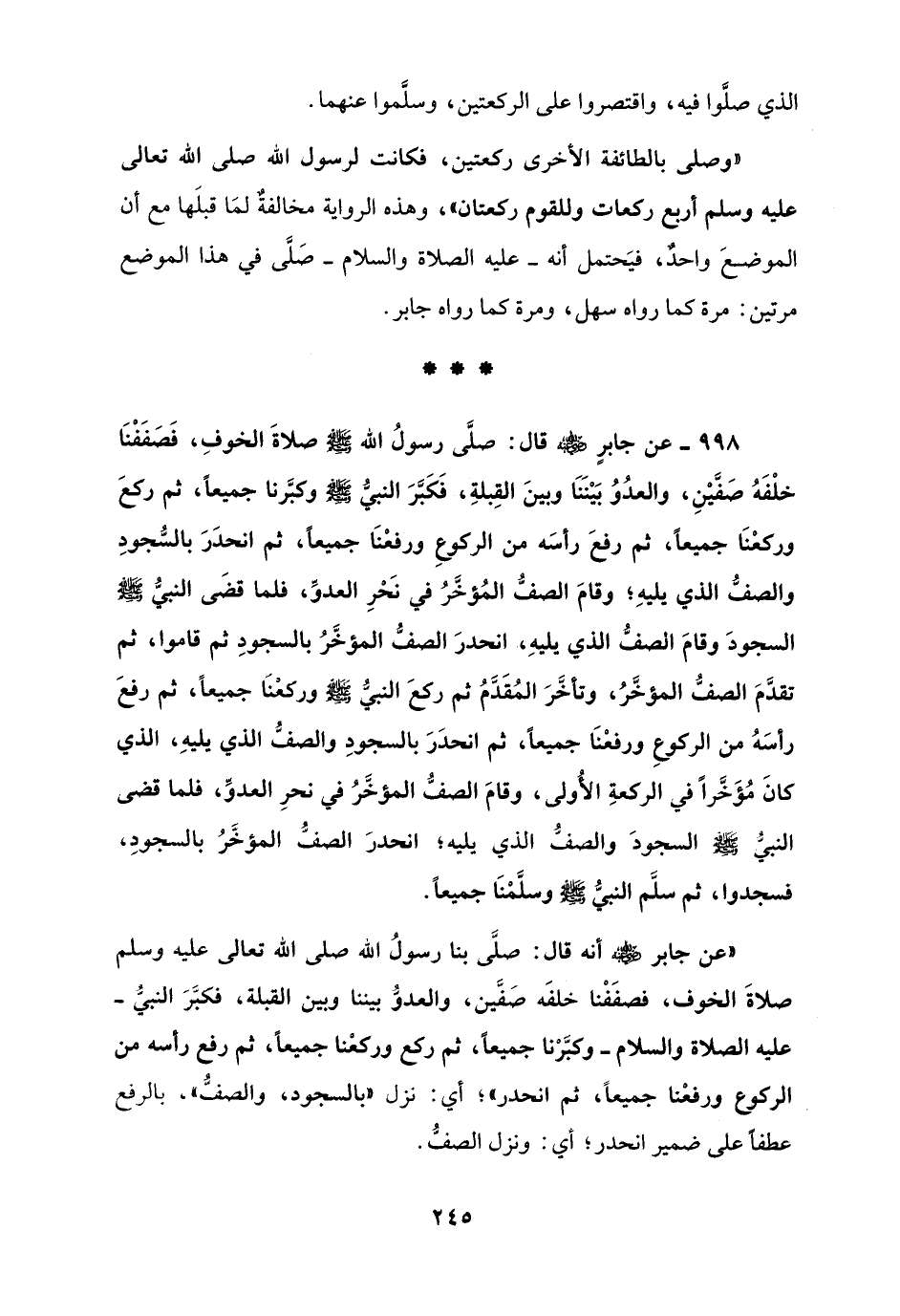 998 - عن جابرٍ - رضي الله عنه -: قال: صلَّى رسولُ الله - صلى الله عليه وسلم - صلاةَ الخوفِ، فَصَفَفْنَا خلْفَهُ صَفَّيْنِ، والعدُوُ بَيْنَنَا وبينَ القِبلةِ، فَكَبَّرَ النبيُّ - صلى الله عليه وسلم - وكبَّرنا جميعًا، ثم ركعَ وركعْنَا جميعًا، ثم رفعَ رأسَه من الركوعِ ورفعْنَا جميعًا، ثم انحدَرَ بالسُّجودِ والصفُّ الذي يليهِ؛ وقامَ الصفُّ المُؤخَّرُ في نَحْرِ العدوِّ، فلما قضَى النبيُّ - صلى الله عليه وسلم - السجودَ وقامَ الصفُّ الذي يليهِ، انحدرَ الصفُّ المؤخَّرُ بالسجودِ ثم قاموا، ثم تقدَّمَ الصف المؤخَّرُ، وتأخَّرَ المُقَدَّمُ ثم ركعَ النبيُّ - صلى الله عليه وسلم - وركعنَا جميعًا، ثم رفعَ رأسَهُ من الركوعِ ورفعْنَا جميعًا، ثم انحدَرَ بالسجودِ والصفُّ الذي يليهِ، الذي كانَ مُؤَخَّرًا في الركعةِ الأُولى، وقامَ الصفُّ المؤخَّرُ في نحرِ العدوِّ، فلما قضى النبيُّ - صلى الله عليه وسلم - السجودَ والصفُّ الذي يليه؛ انحدرَ الصفُّ المؤخَّرُ بالسجودِ، فسجدوا، ثم سلَّم النبيُّ - صلى الله عليه وسلم - وسلَّمْنَا جميعًا.