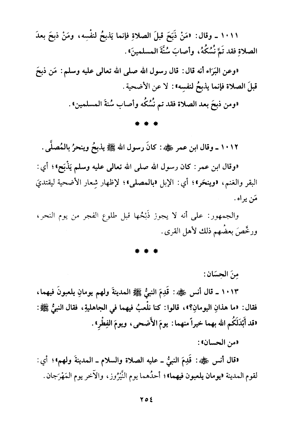 1013 - قال أنس - رضي الله عنه -: قَدِمَ النبيُّ - صلى الله عليه وسلم - المدينةَ ولهم يومانِ يلعبونَ فيهما، فقال: "ما هذانِ اليومانِ؟ "، قالوا: كنا نلْعبُ فيهما في الجاهليةِ، فقال النبيُّ - صلى الله عليه وسلم -: "قد أَبْدَلَكُم الله بهما خيراً منهما: يومَ الأَضحى، ويومَ الفِطْرِ".