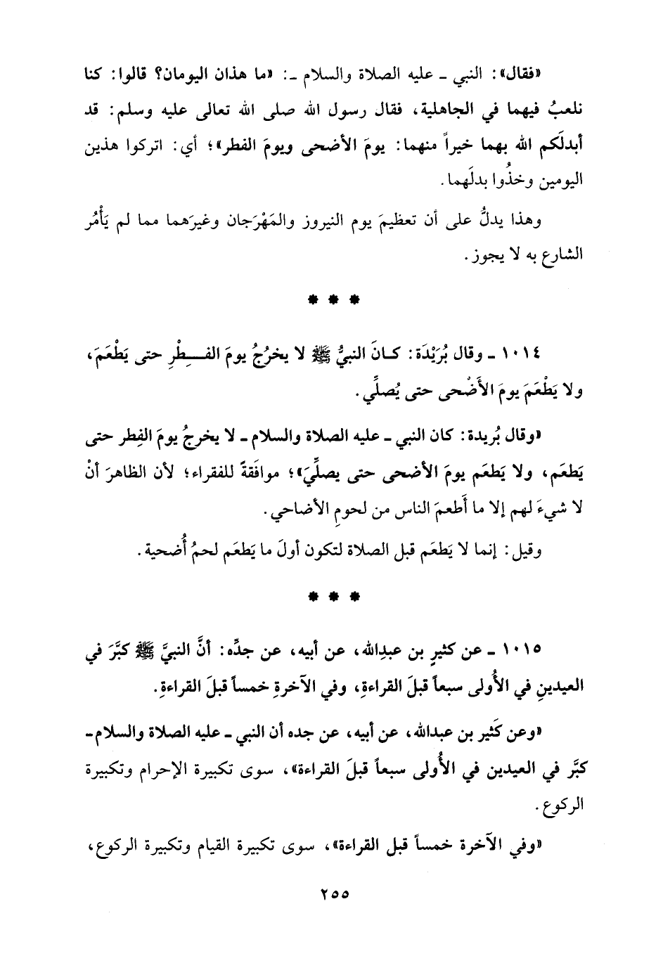 وهذا يدلُّ على أن تعظيمَ يوم النيروز والمَهْرَجان وغيرَهما مما لم يَأمُر الشارع به لا يجوز.