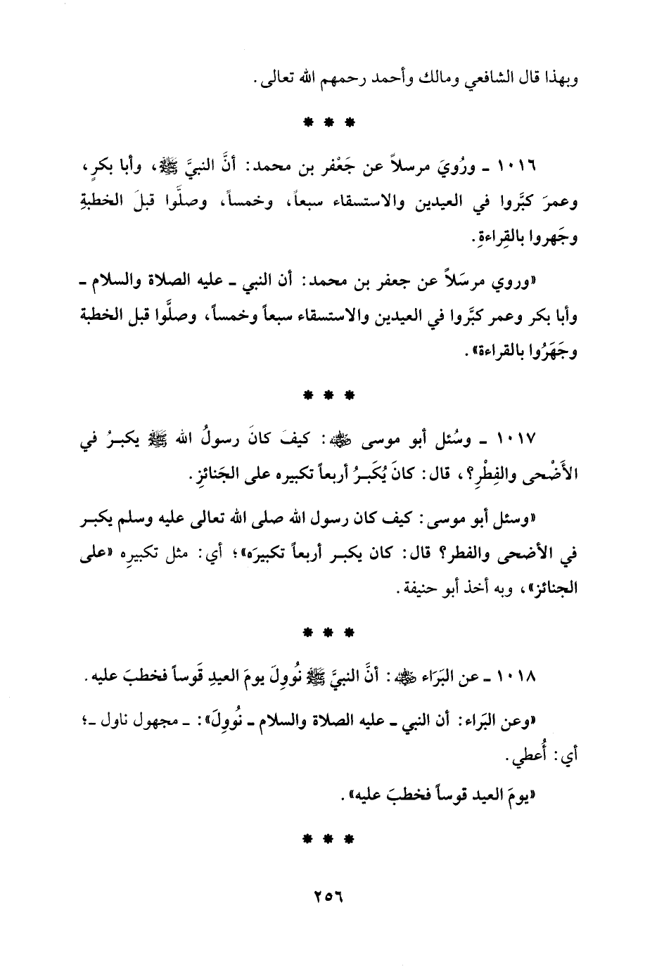 1016 - ورويَ مرسلاً عن جَعفر بن محمد: أنَّ النبيَّ - صلى الله عليه وسلم -، وأبا بكرٍ، وعمرَ كبَّروا في العيدين والاستسقاء سبعاً، وخمساً، وصلوا قبلَ الخطبةِ وجَهروا بالقِراءةِ.