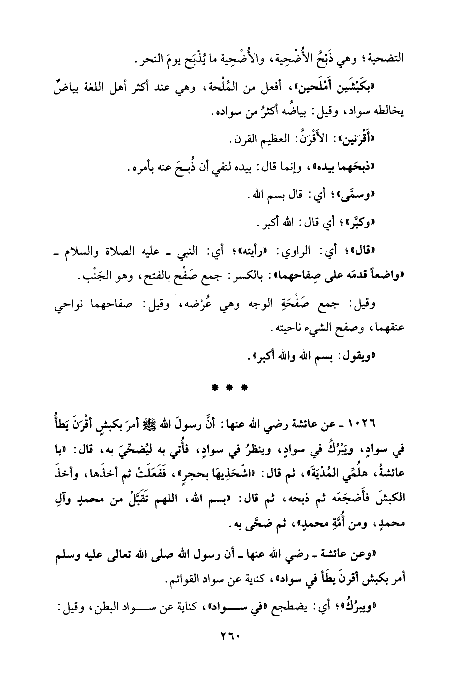 1026 - عن عائشة رضي الله عنها: أن رسولَ الله - صلى الله عليه وسلم - أمرَ بكبشٍ أقْرَنَ يَطأُ في سوادٍ، ويَبْرُكُ في سوادٍ، وينظرُ في سوادٍ، فأُتي به ليُضحِّيَ به، قال: "يا عائشةُ، هلُمِّي المُدْيَةَ"، ثم قال: "اشْحَذِيهَا بحجرٍ"، فَفَعَلَتْ ثم أخذَها، وأخذَ الكبشَ فأضجَعَه ثم ذبحه، ثم قال: "بسم الله، اللهم تَقَبَّلْ من محمدٍ وآلِ محمدٍ، ومن أُمَّةِ محمدٍ"، ثم ضحَّى به.