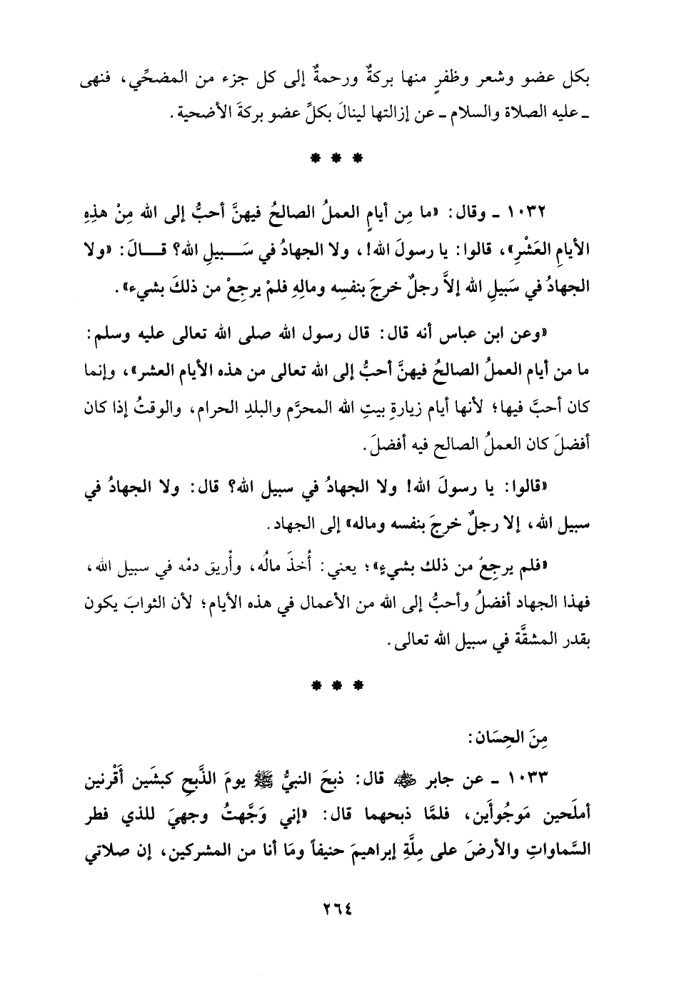 1033 - عن جابر - رضى الله عنه - قال: ذبحَ النبيُّ - صلى الله عليه وسلم - يوم الذَّبح كبشَين أَقْرنين أملَحين مَوجُوأَين، فلما ذبحهما قال: "إني وَجَّهتُ وجهيَ للذي فطر السَّماواتِ والأرضَ على مِلةِ إبراهيمَ حنيفاً ومَا أنا من المشركين، إن صلاتي