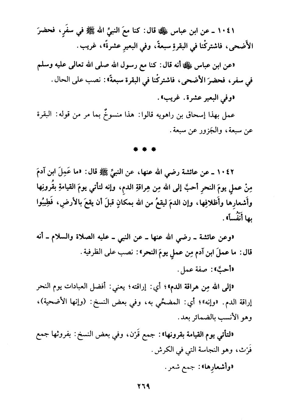 1042 - عن عائشة رضي الله عنها، عن النبيِّ - صلى الله عليه وسلم - قال: "ما عَمِلَ ابن آدمَ مِنْ عملٍ يومَ النحرِ أحبَّ إلى الله مِن هِراقةِ الدمِ، وإنه لتأتي يومَ القيامةِ بقُرونها وأَشعارِها وأَظلافِها، وإن الدمَ ليقعُ من الله بمكانٍ قبلَ أن يقعَ بالأرضِ، فَطِيبُوا بها أَنْفُساً".