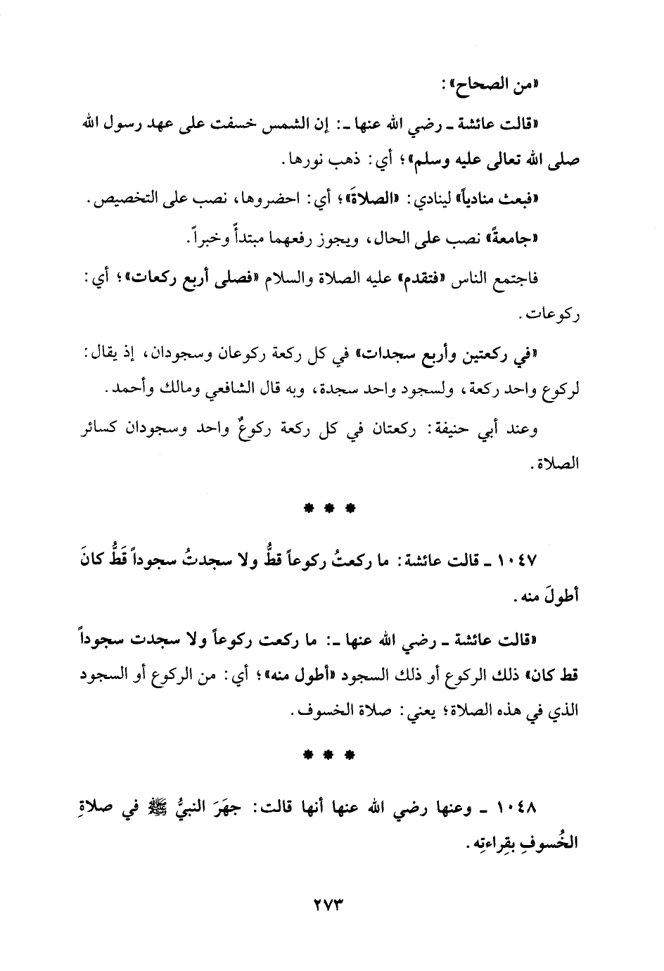 1048 - وعنها رضي الله عنها أنها قالت: جهَرَ النبيُّ - صلى الله عليه وسلم - في صلاةِ الخُسوفِ بقِراءتِه.