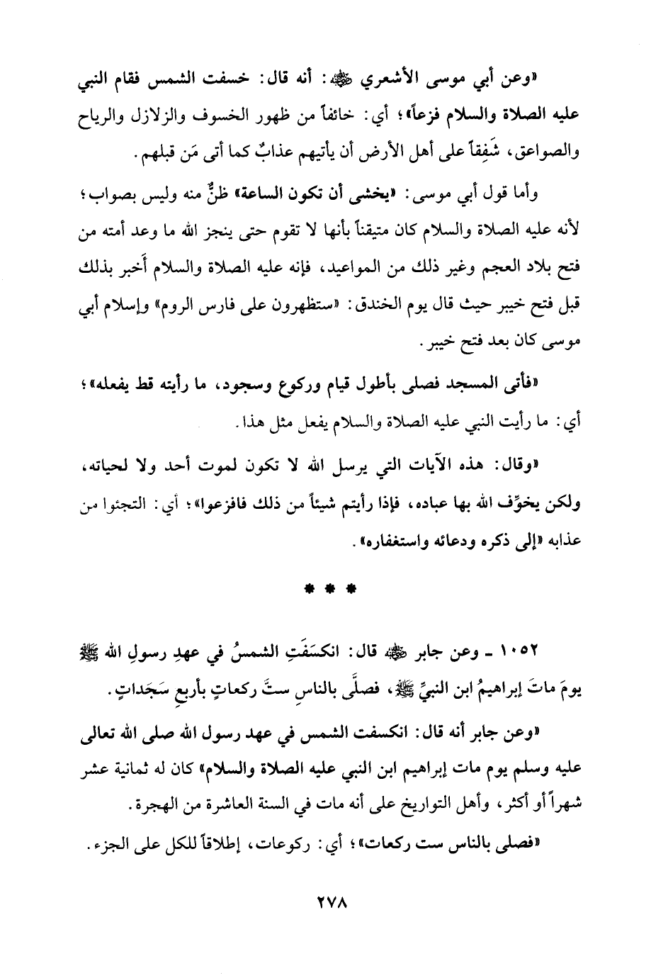 1052 - وعن جابر - رضى الله عنه قال: انكسَفَتِ الشمسُ في عهدِ رسولِ الله - صلى الله عليه وسلم - يومَ ماتَ إبراهيمُ ابن النبيِّ - صلى الله عليه وسلم -، فصلَّى بالناسِ ستَّ ركعاتٍ بأربعِ سَجَداتٍ.