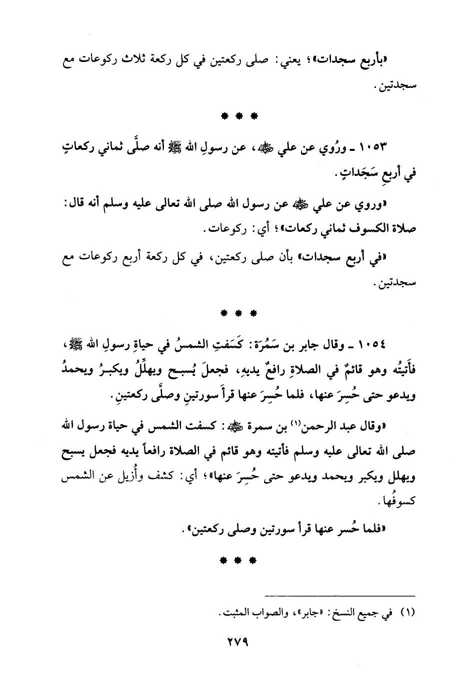 1054 - وقال جابر بن سَمُرَة: كسَفتِ الشمسُ في حياةِ رسولِ الله - صلى الله عليه وسلم -، فأتيتُه وهو قائم في الصلاةِ رافع يديهِ، فجعلَ يُسبح ويهلِّلُ ويكبرُ ويحمدُ ويدعو حتى حُسِرَ عنها، فلما حُسِرَ عنها قرأَ سورتينِ وصلَّى ركعتينِ.