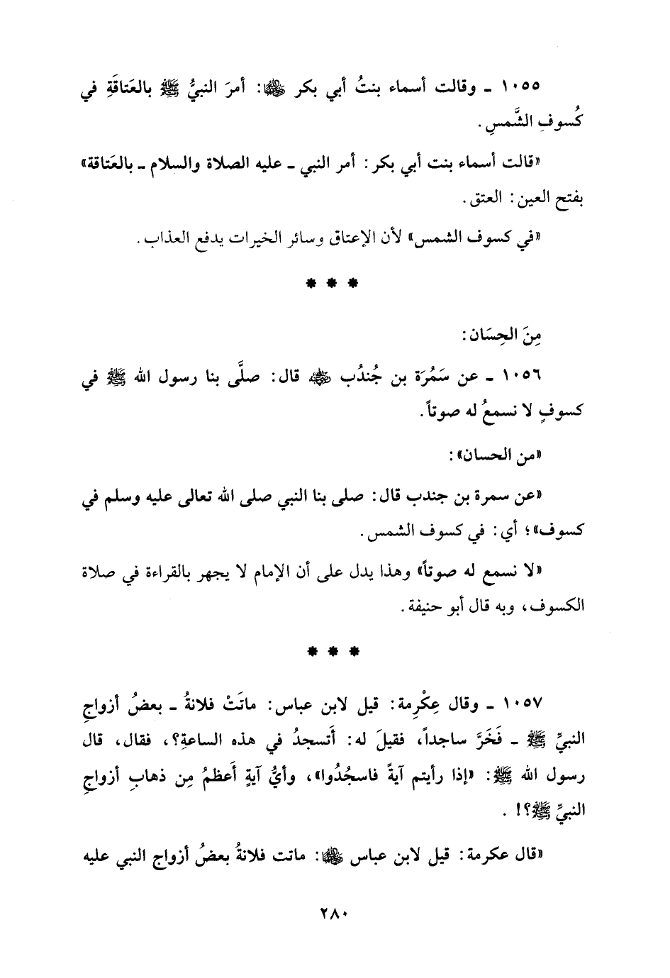 1055 - وقالت أسماء بنتُ أبي بكر - رضي الله عنها -: أمرَ النبيُّ - صلى الله عليه وسلم - بالعَتاقَةِ في كُسوف الشَّمسِ.