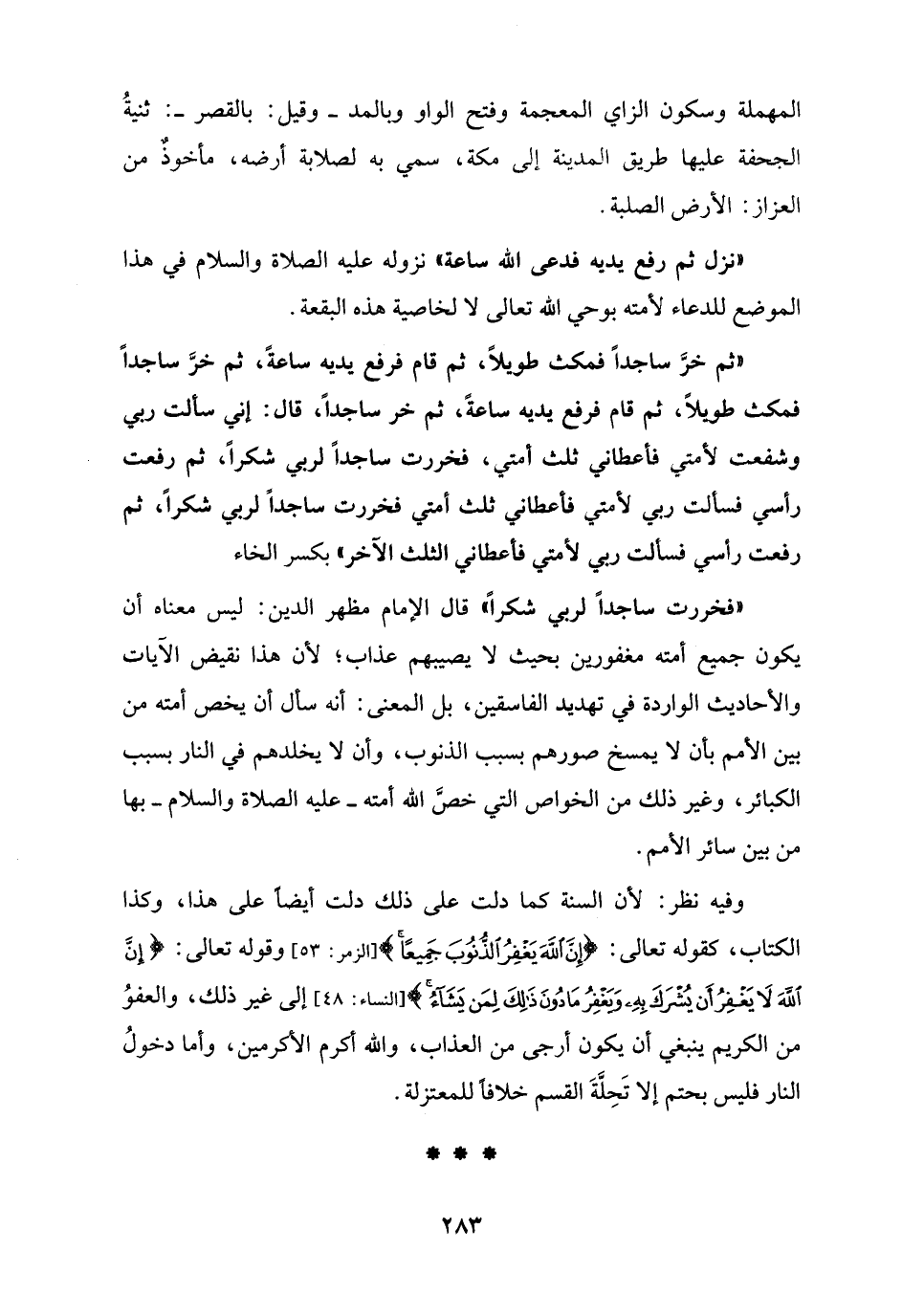 "فخررت ساجداً لربي شكراً" قال الإمام مظهر الدين: ليس معناه أن يكون جميع أمته مغفورين بحيث لا يصيبهم عذاب؛ لأن هذا نقيض الآيات والأحاديث الواردة في تهديد الفاسقين، بل المعنى: أنه سأل أن يخص أمته من بين الأمم بأن لا يمسخ صورهم بسبب الذنوب، وأن لا يخلدهم في النار بسبب الكبائر، وغير ذلك من الخواص التي خصَّ الله أمته - عليه الصلاة والسلام - بها من بين سائر الأمم.