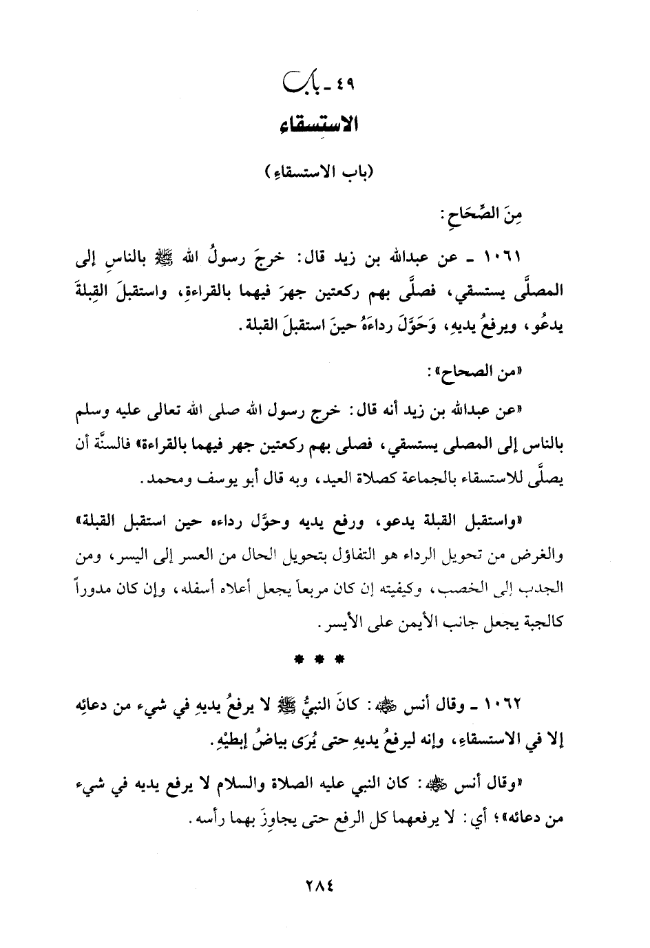 1061 - عن عبد الله بن زيد قال: خرجَ رسولُ الله - صلى الله عليه وسلم - بالناسِ إلى المصلَّى يستسقي، فصلَّى بهم ركعتين جهرَ فيهما بالقراءةِ، واستقبلَ القِبلةَ يدعُو، ويرفعُ يديهِ، وَحَوَّلَ رداءَهُ حينَ استقبلَ القبلة.