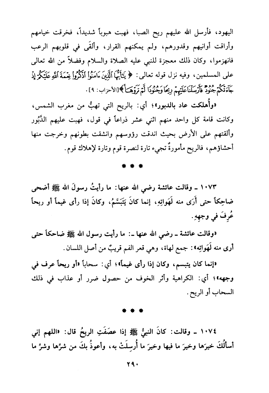 1074 - وقالت: كانَ النبيُّ - صلى الله عليه وسلم - إذا عصَفَتِ الريحُ قال: "اللهم إني أسألُكَ خيرَها وخيرَ ما فيها وخيرَ ما أُرسِلَتْ به، وأعوذُ بكَ من شرِّها وشرِّ ما