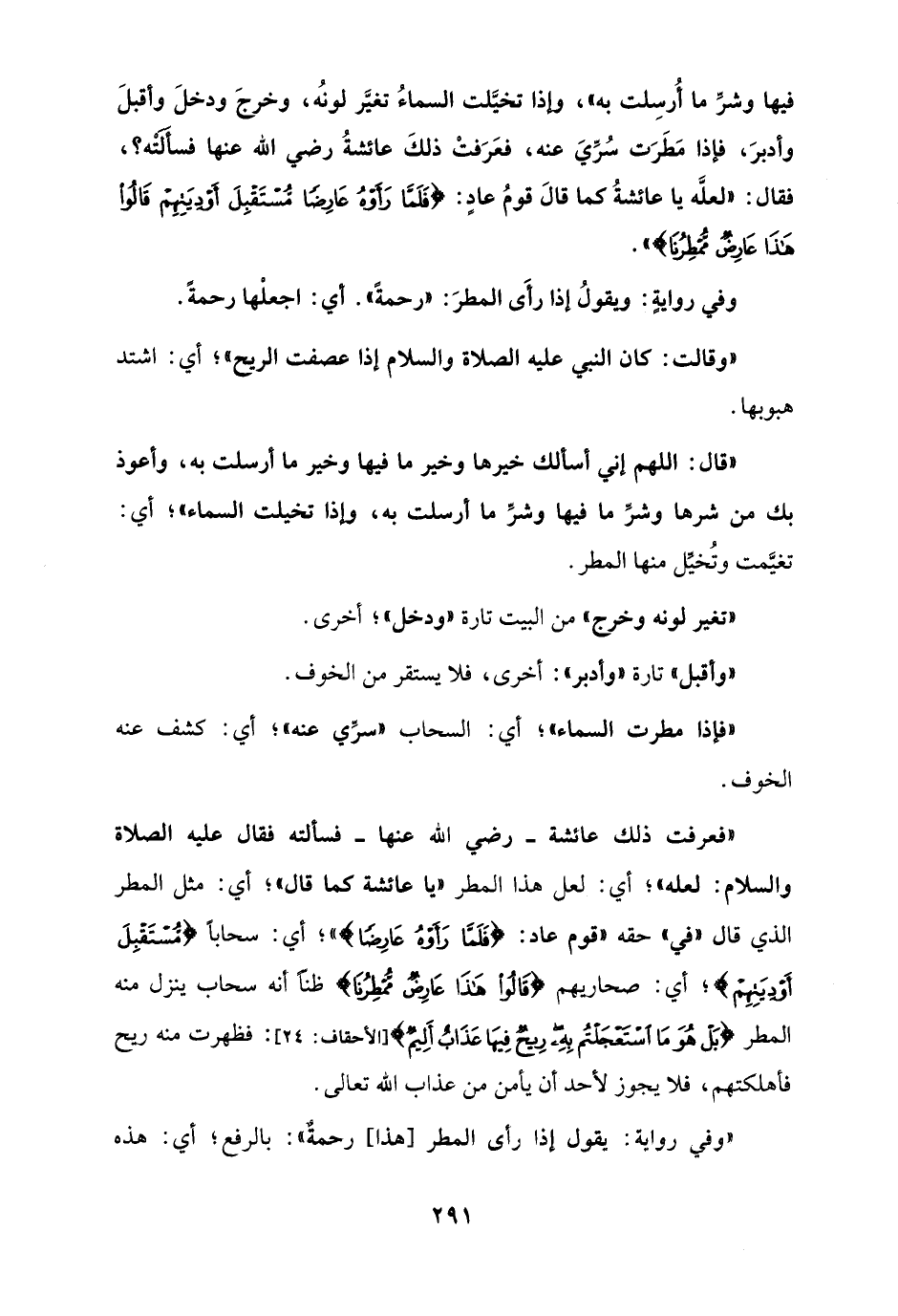 فيها وشرِّ ما أُرسِلت به"، وإذا تخيَّلت السماءُ تغيَّر لونُه، وخرجَ ودخلَ وأقبلَ وأدبرَ، فإذا مَطَرَت سُرِّيَ عنه، فعَرَفتْ ذلكَ عائشةُ رضي الله عنها فسألتْه؟، فقال: "لعلَّه يا عائشةُ كما قالَ قومُ عادٍ: {فَلَمَّا رَأَوْهُ عَارِضًا مُسْتَقْبِلَ أَوْدِيَتِهِمْ قَالُوا هَذَا عَارِضٌ مُمْطِرُنَا}.