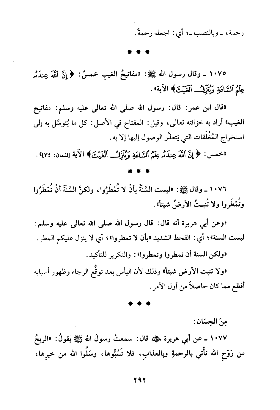 1075 - وقال رسول الله - صلى الله عليه وسلم -: "مفاتيحُ الغيبِ خمسٌ: {إِنَّ اللَّهَ عِنْدَهُ عِلْمُ السَّاعَةِ وَيُنَزِّلُ الْغَيْثَ} الآية".