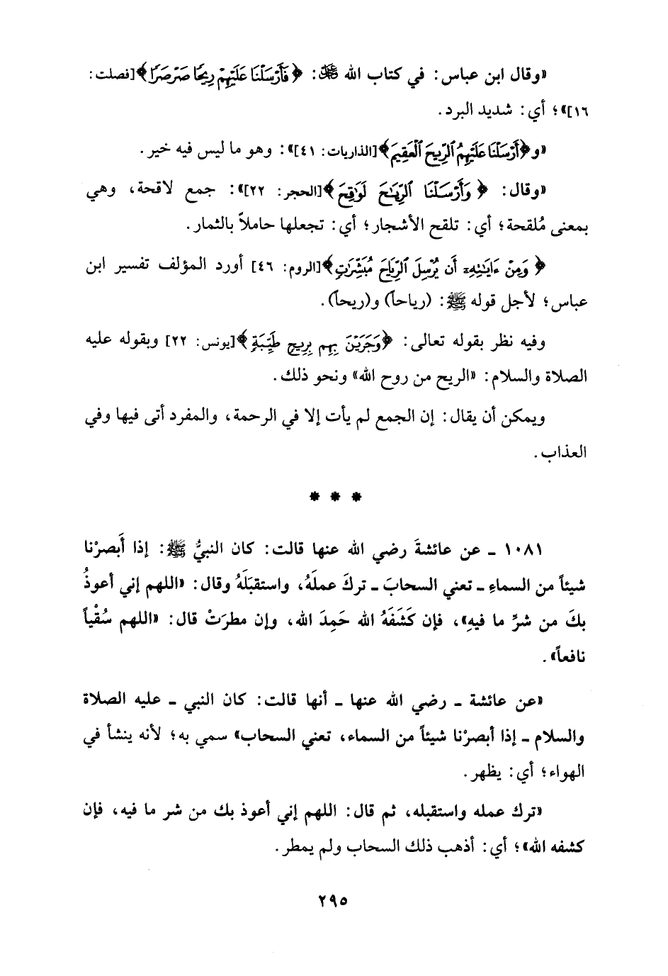 " {وَمِنْ آيَاتِهِ أَنْ يُرْسِلَ الرِّيَاحَ مُبَشِّرَاتٍ} [الروم: 46] أورد المؤلف تفسير ابن عباس؛ لأجل قوله - صلى الله عليه وسلم -: (رياح" و (ريحاً).