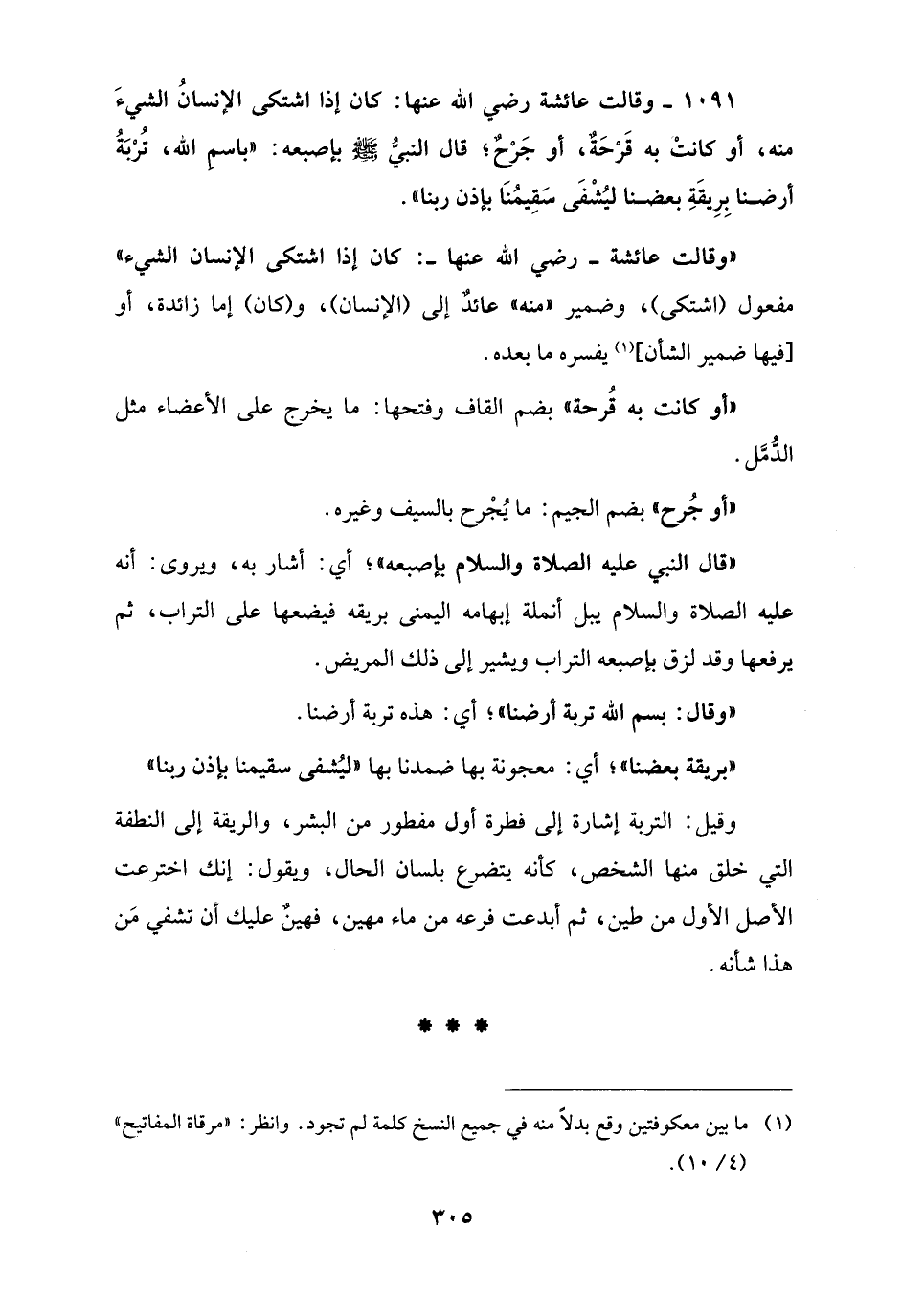 1091 - وقالت عائشة رضي الله عنها: كان إذا اشتكى الإنسانُ الشيءَ منه، أو كانت به قَرْحَةٌ، أو جَرْحٌ؛ قال النبيُّ - صلى الله عليه وسلم - بإصبعه: "باسم الله، تُرْبَةُ أرضنا بِرِيقَةِ بعضنا ليُشْفَى سَقِيمُنَا بإذن ربنا".