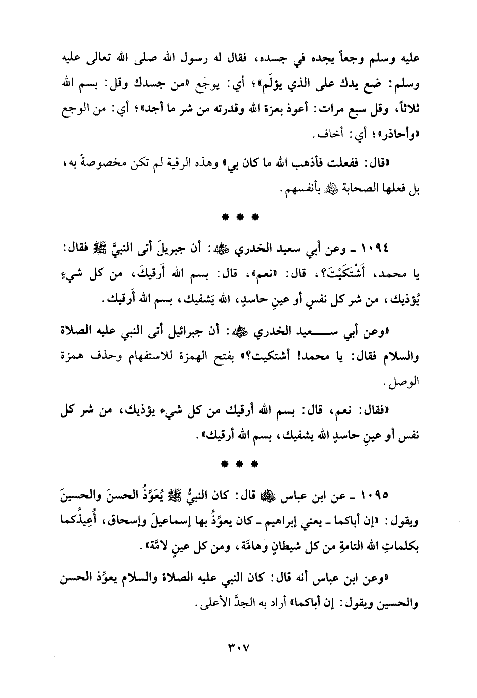 1094 - وعن أبي سعيد الخدري - رضي الله عنه -: أن جبريلَ أتى النبيَّ - صلى الله عليه وسلم - فقال: يا محمد، أَشتَكَيْتَ؟، قال: "نعم"، قال: بسم الله أَرقيكَ، من كل شيءٍ يُؤذيك، من شر كل نفسٍ أو عينِ حاسدٍ، الله يَشفيك، بسم الله أَرقيك.