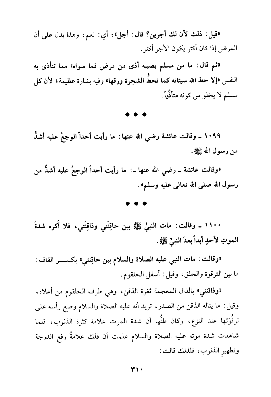 1099 - وقالت عائشة رضي الله عنها: ما رأيت أحداً الوجعُ عليه أشدُّ من رسول الله - صلى الله عليه وسلم -.