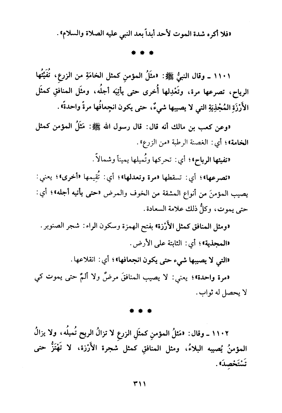 1101 - وقال النبيُّ - صلى الله عليه وسلم -: "مثَلُ المؤمنِ كمثل الخامَةِ من الزرعِ، تُفَيِّئُها الرياح، تصرعها مرة، وتَعْدِلها أُخرى حتى يأتِيَه أجلُه، ومثَل المنافقِ كمثَل الأَرْزَةِ المُجْذِيَةِ التي لا يصيبها شيءٌ، حتى يكون انجعافُها مرةً واحدةً".
