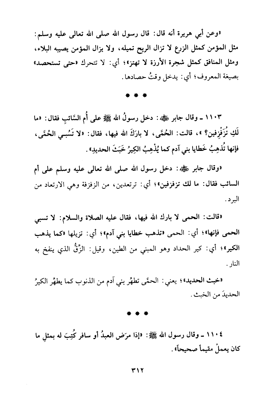 1103 - وقال جابر - رضي الله عنه -: دخل رسولُ الله - صلى الله عليه وسلم - على أُم السَّائبِ فقال: "ما لَكِ تُزَفْزِفين؟ "، قالت: الحُمَّى، لا بارَكَ الله فيها، فقال: "لا تَسُبي الحُمَّى، فإنها تُذهِبُ خَطايا بني آدم كما يُذْهِبُ الكِيرُ خَبَثَ الحديدِ".
