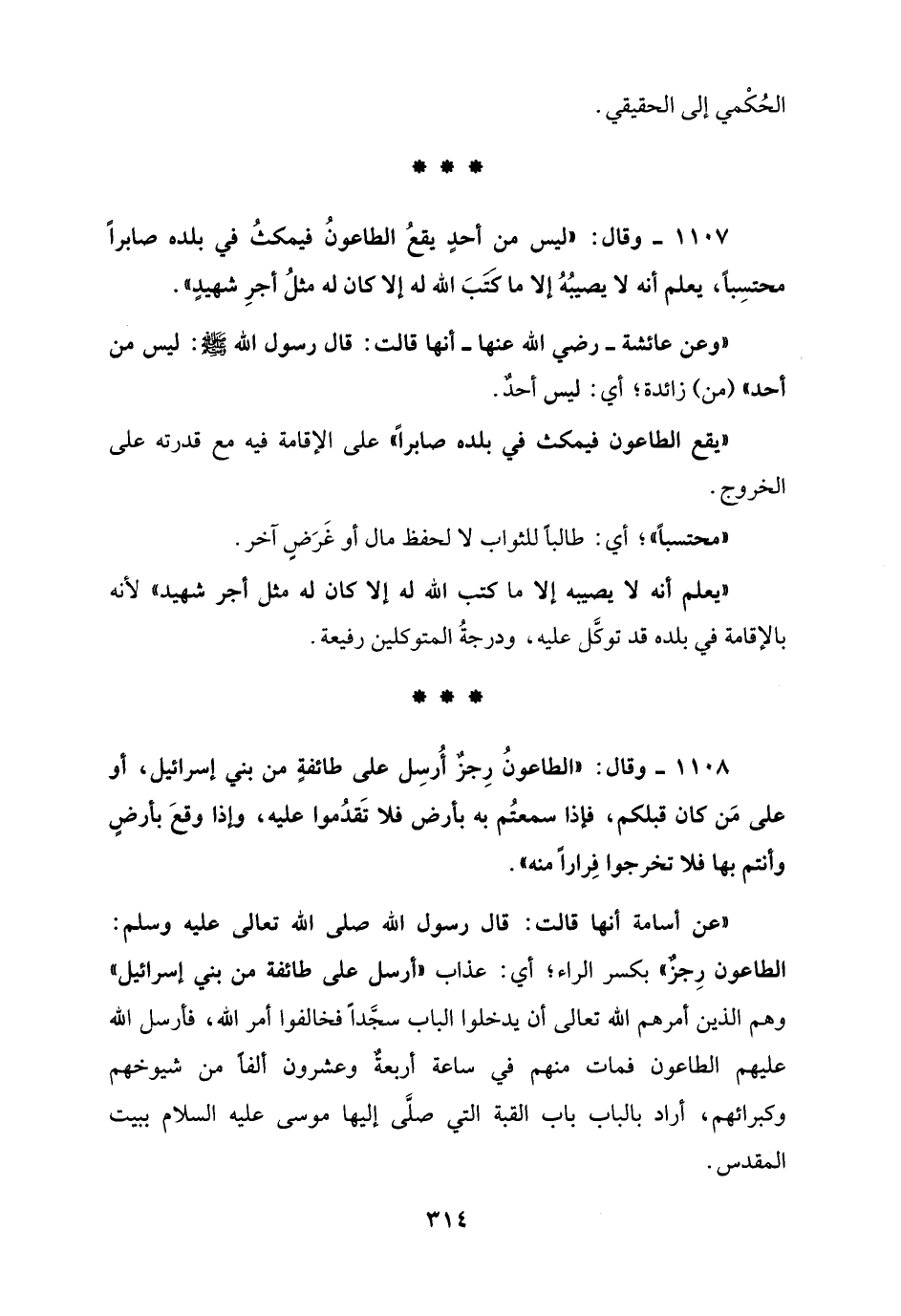1108 - وقال: "الطاعونُ رِجزٌ أُرسِل على طائفةٍ من بني إسرائيل، أو على مَن كان قبلكم، فإذا سمعتُم به بأرض فلا تَقدُموا عليه، وإذا وقعَ بأرضٍ وأنتم بها فلا تخرجوا فِراراً منه".