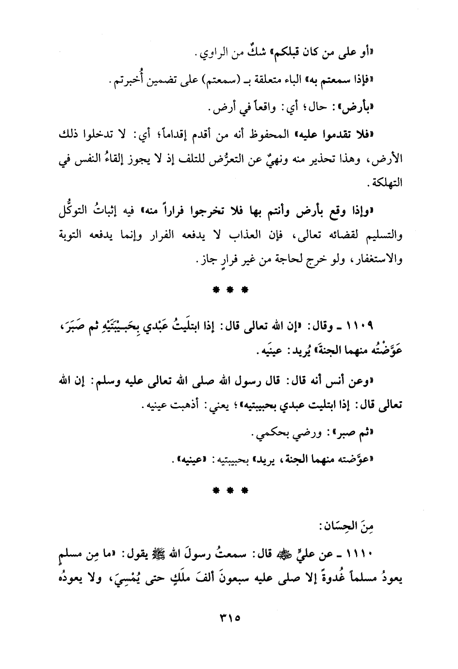 1109 - وقال: "إن الله تعالى قال: إذا ابتلَيتُ عَبْدي بِحَبيْبَتَيْهِ ثم صَبَرَ، عَوَّضْتُه منهما الجنةَ" يُريد: عينَيه.