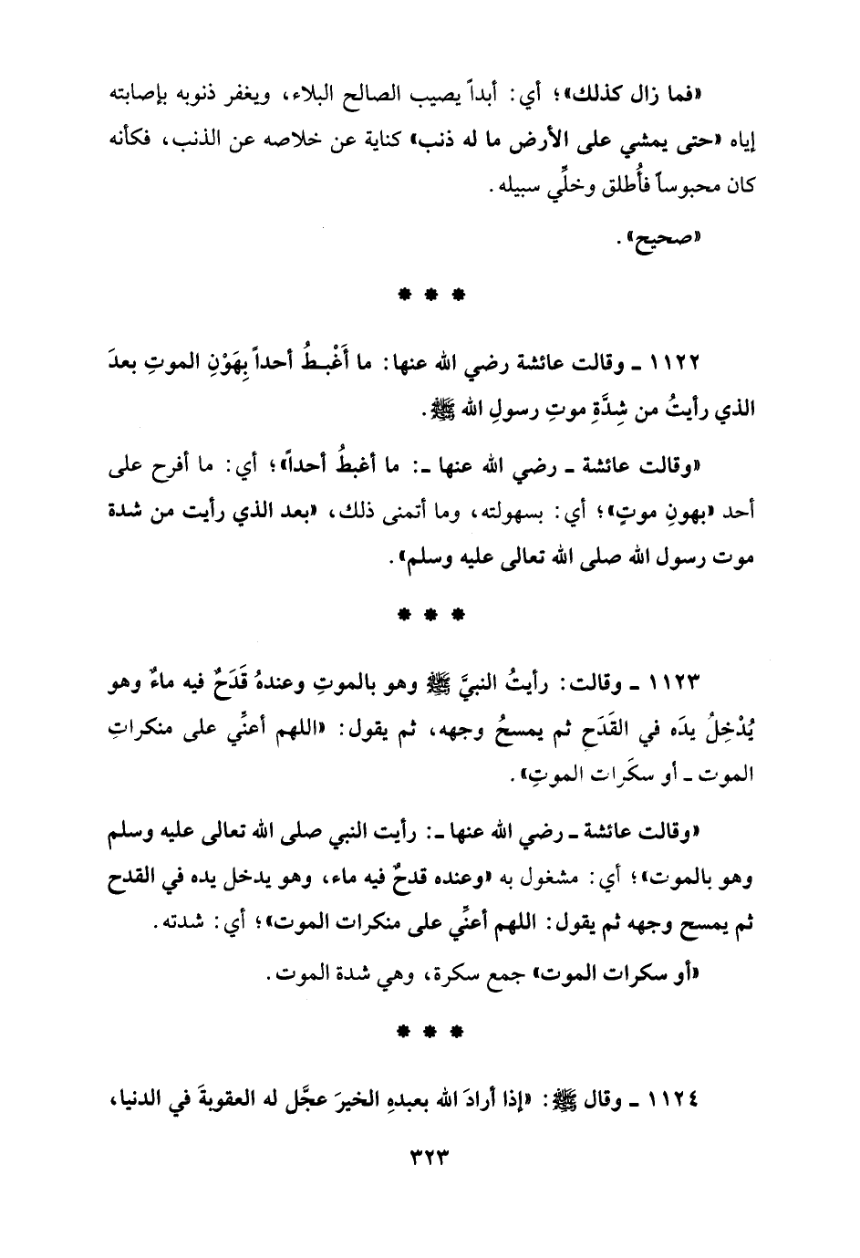 1122 - وقالت عائشة رضي الله عنها: ما أَغْبطُ أحداً بِهَوْنِ الموتِ بعدَ الذي رأيتُ من شِدَّةِ موتِ رسولِ الله - صلى الله عليه وسلم -.