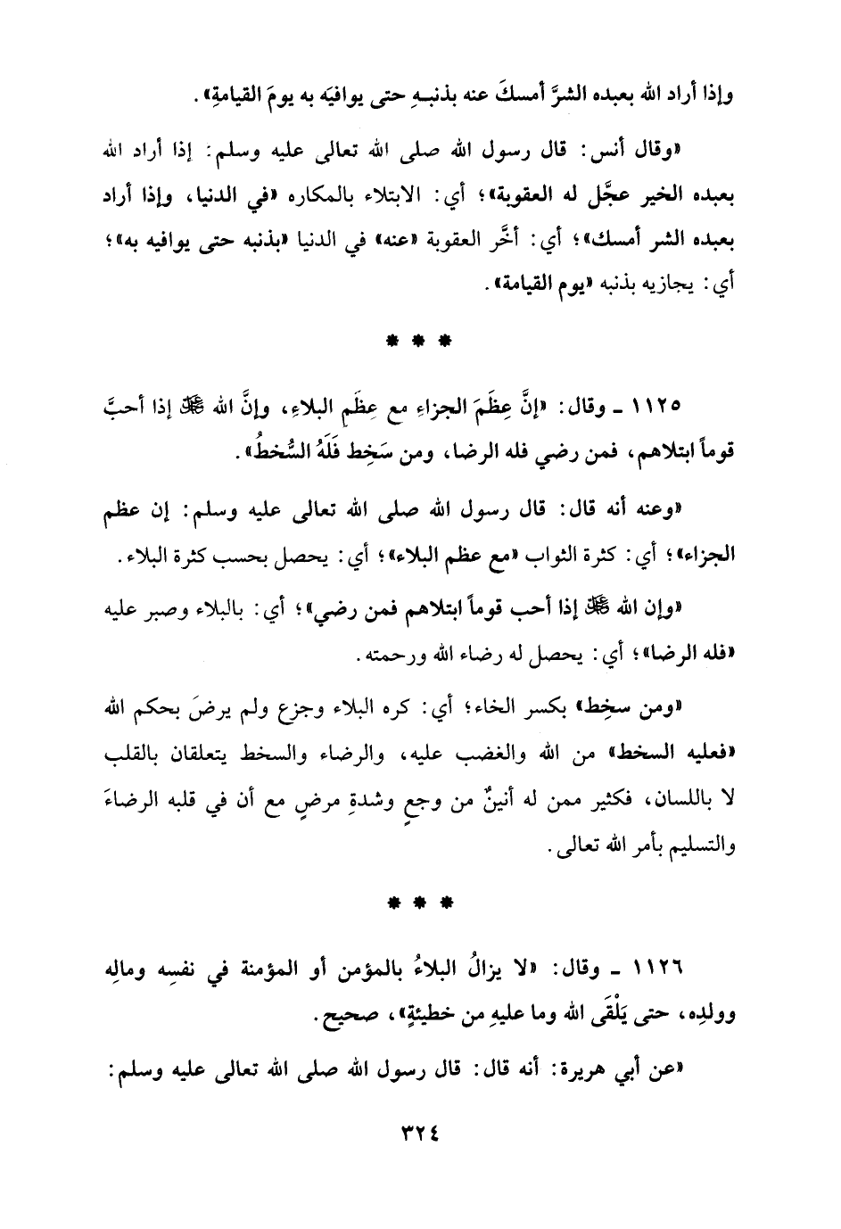 1125 - وقال: "إنَّ عِظَمَ الجزاءِ مع عِظَم البلاءِ، وإنَّ الله عز وجل إذا أحبَّ قوماً ابتلاهم، فمن رضي فله الرضا، ومن سَخِط فَلَهُ السُّخطُ".