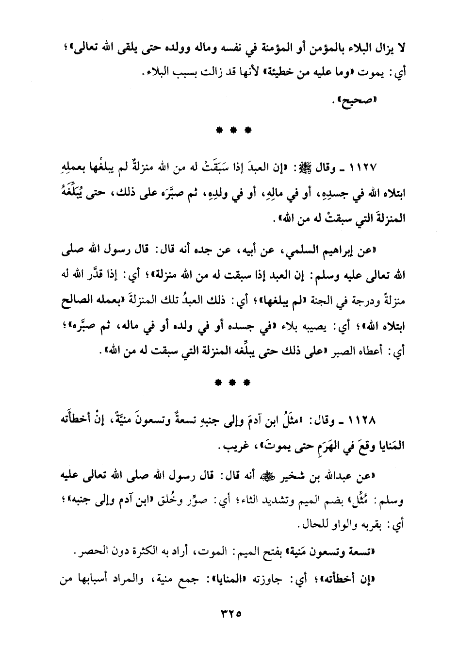 1128 - وقال: "مثَلُ ابن آدمَ وإلى جنبهِ تسعةٌ وتسعونَ منيَّةً، إنْ أخطأَته المَنايا وقعَ في الهَرَمِ حتى يموتَ"، غريب.