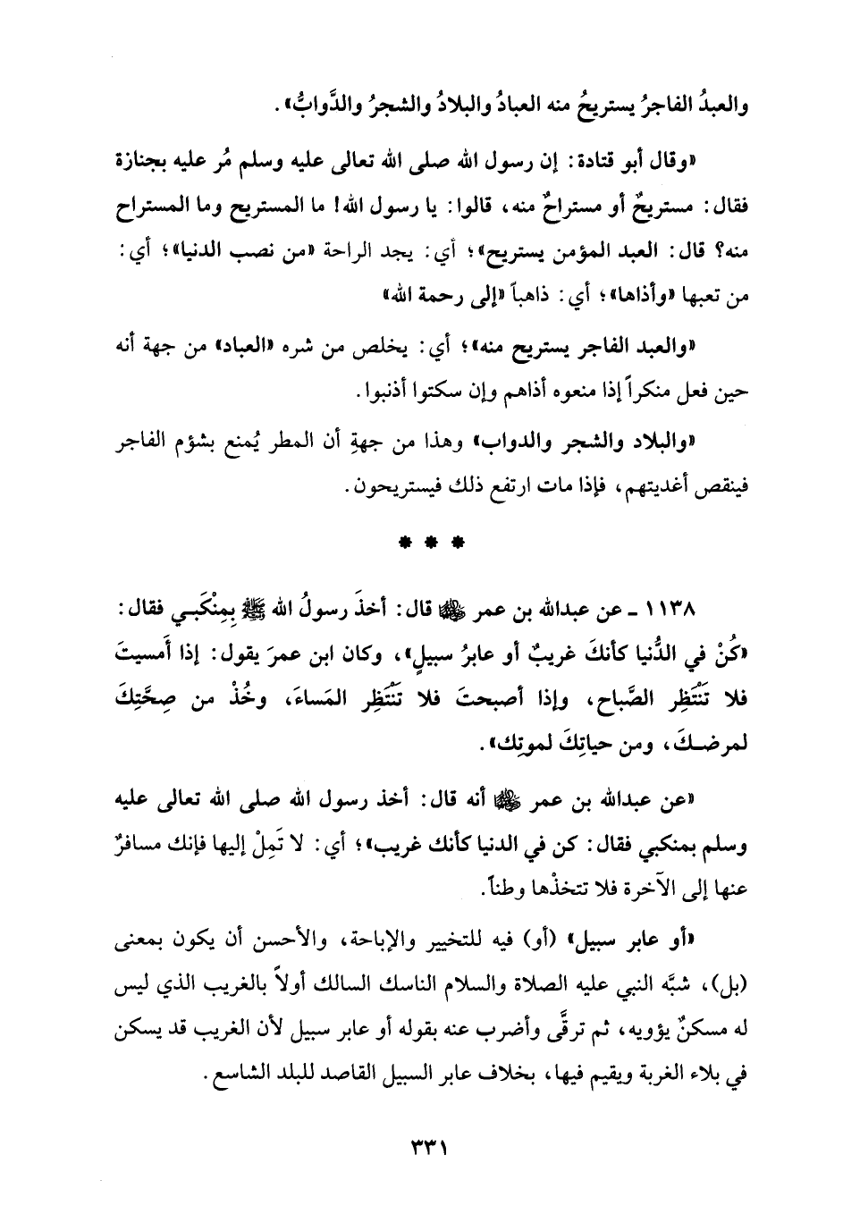 1138 - عن عبد الله بن عمر - رضي الله عنه - قال: أخذَ رسولُ الله - صلى الله عليه وسلم - بِمِنْكَبي فقال: "كُنْ في الدُّنيا كأنكَ غريبٌ أو عابرُ سبيلٍ"، وكان ابن عمرَ يقول: إذا أَمسيتَ فلا تَنْتَظِر الصَّباح، وإذا أصبحتَ فلا تنتظِر المَساءَ" وخُذْ من صِحَّتِكَ لمرضكَ، ومن حياتِكَ لموتِك".