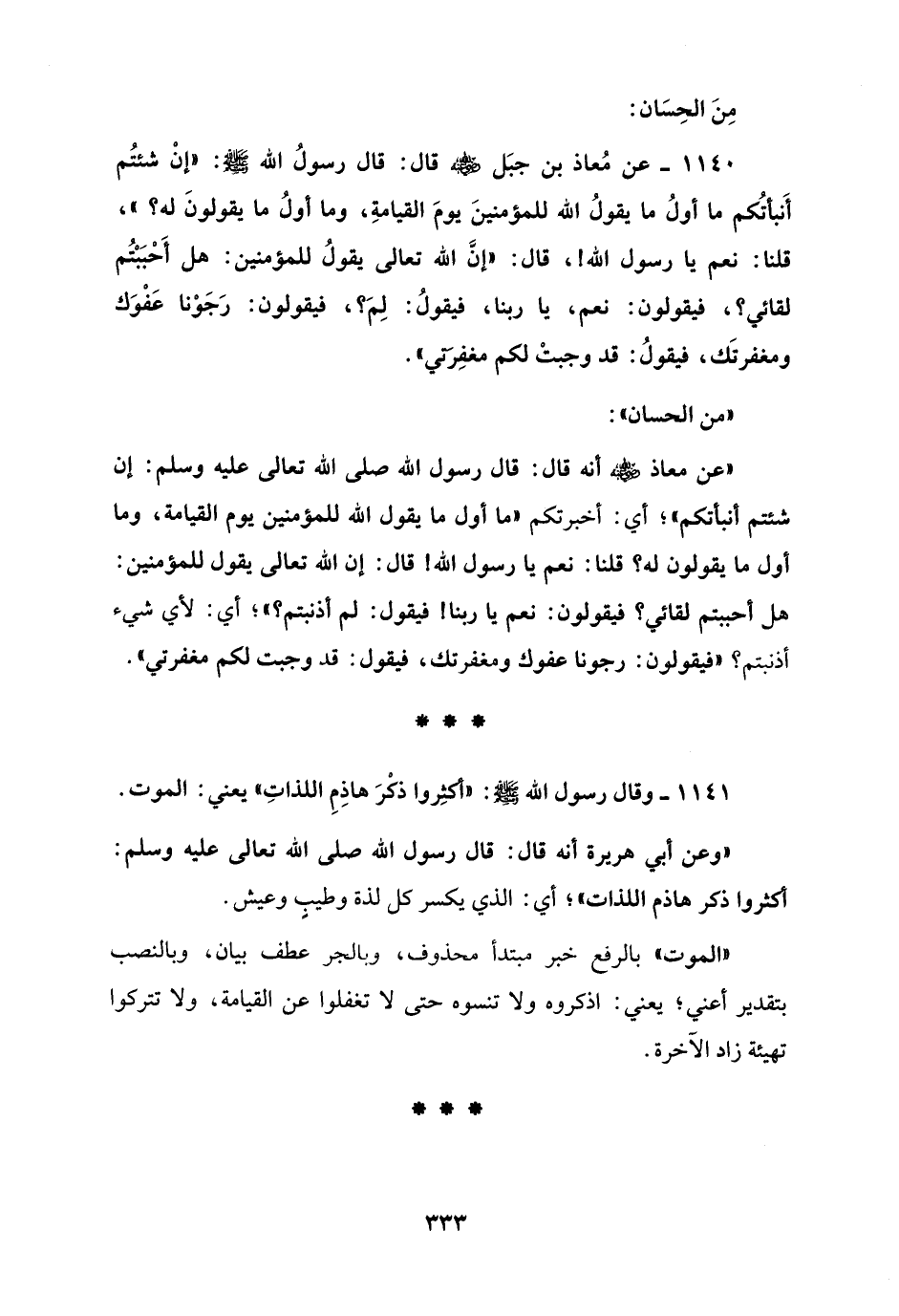 1140 - عن مُعاذ بن جبَل - رضي الله عنه - قال: قال رسولُ الله - صلى الله عليه وسلم -: "إنْ شئتُم أَنبأتُكم ما أولُ ما يقولُ الله للمؤمنينَ يومَ القيامةِ، وما أولُ ما يقولونَ له؟ "، قلنا: نعم يا رسول الله!، قال: "إن الله تعالى يقولُ للمؤمنين: هل أَحْبَبْتُم لقائي؟، فيقولون: نعم، يا ربنا، فيقولُ: لِمَ؟، فيقولون: رَجَوْنا عَفْوَك ومغفرتَك، فيقولُ: قد وجبتْ لكم مغفِرتي".
