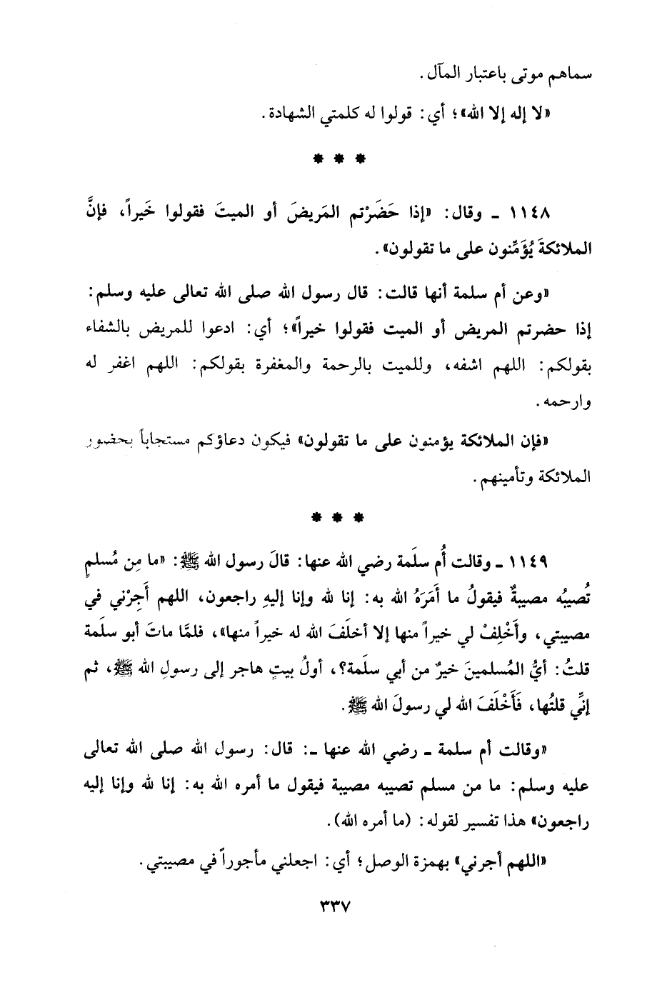 1149 - وقالت أُم سلَمة رضي الله عنها: قالَ رسول الله - صلى الله عليه وسلم -: "ما مِن مُسلمٍ تُصيبُه مصيبةٌ فيقولُ ما أَمَرَهُ الله به: إنا لله وإنا إليهِ راجعون، اللهم أَجِرْني في مصيبتي، وأَخْلِفْ لي خيراً منها إلا أخلَفَ الله له خيراً منها، فلمَّا ماتَ أبو سلَمة قلتُ: أيُّ المُسلمينَ خيرٌ من أبي سلَمة؟، أولُ بيتٍ هاجر إلى رسولِ الله - صلى الله عليه وسلم -، ثم إنِّي قلتُها، فَأَخْلَفَ الله لي رسولَ الله - صلى الله عليه وسلم -.