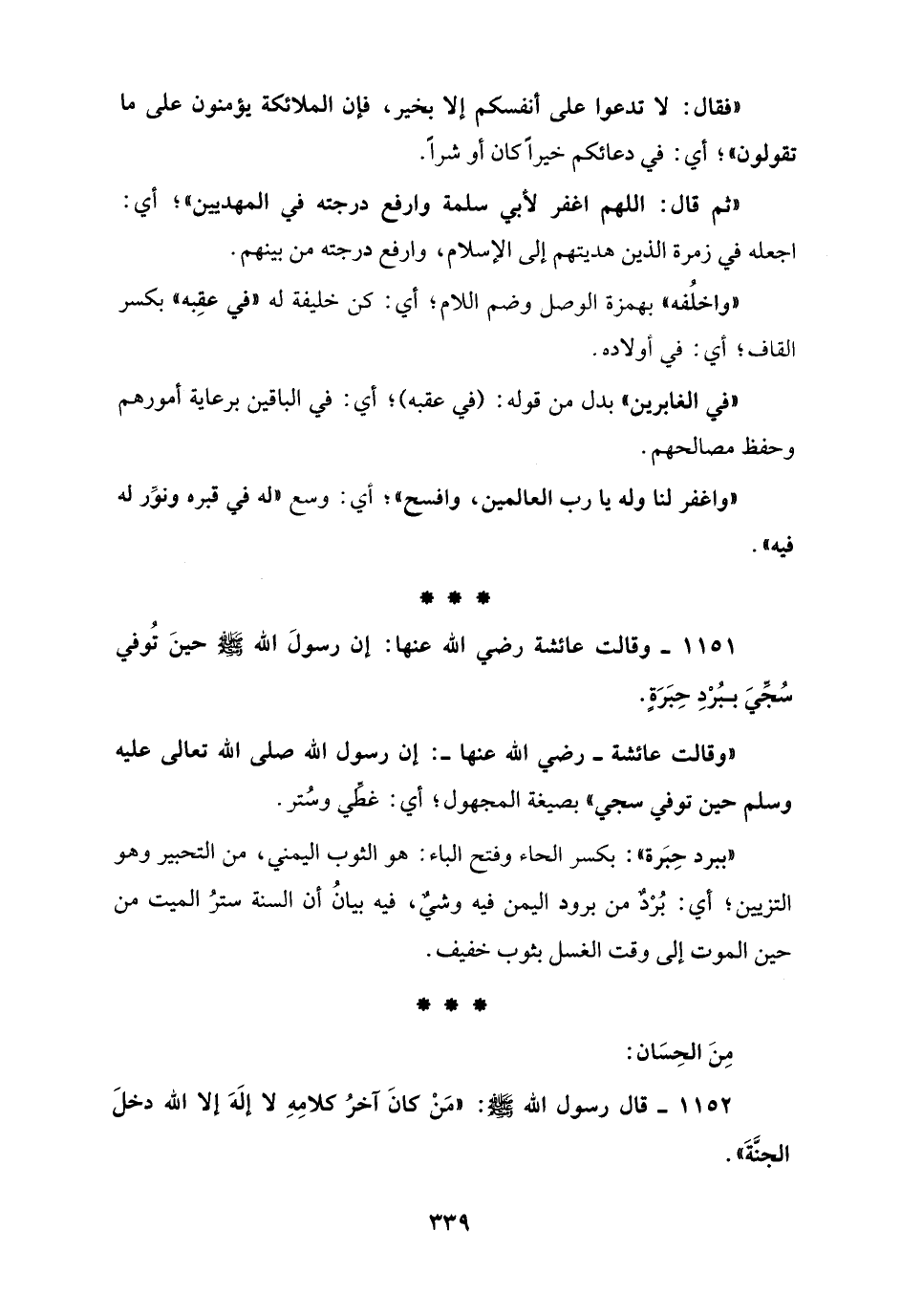 1151 - وقالت عائشة رضي الله عنها: إن رسولَ الله - صلى الله عليه وسلم - حينَ تُوفي سُجِّيَ ببُرْدِ حِبَرَةٍ.