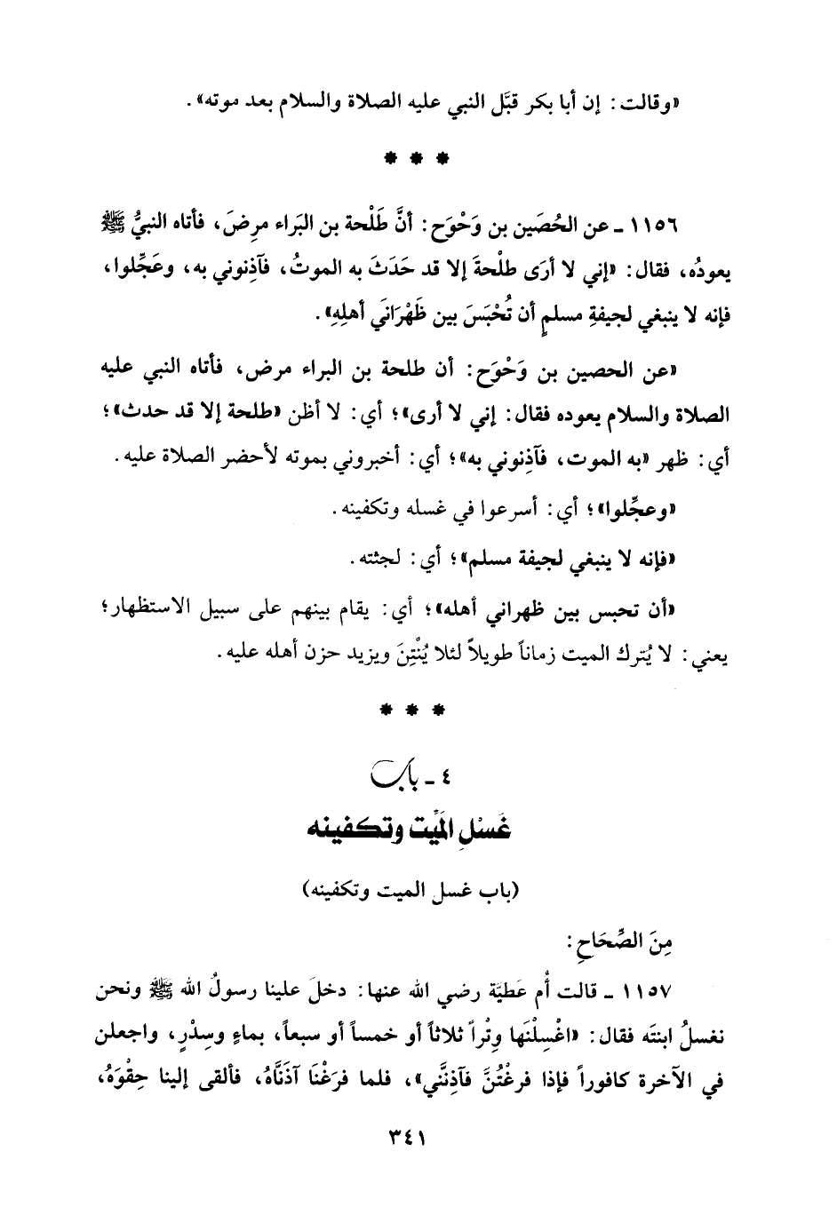 1156 - عن الحُصَين بن وَحْوَح: أنَّ طَلْحة بن البَراء مرِضَ، فأتاه النبيُّ - صلى الله عليه وسلم - يعودُه، فقال: "إني لا أرَى طلْحةَ إلا قد حَدَثَ به الموتُ، فآذِنوني به، وعَجِّلوا، فإنه لا ينبغي لجيفةِ مسلم أن تُحْبَسَ بين ظَهْرَانيَ أهلِهِ".