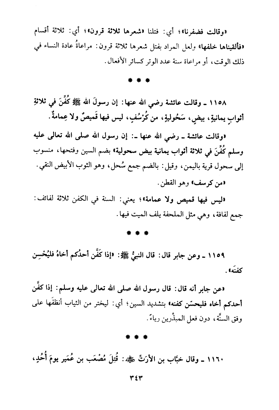 1158 - وقالت عائشة رضي الله عنها: إن رسولَ الله - صلى الله عليه وسلم - كُفِّنَ في ثلاثةِ أثوابٍ يمانيةٍ، بيضٍ، سَحُوليةٍ، من كُرْسُفٍ، ليس فيها قَميصٌ ولا عِمامةٌ.