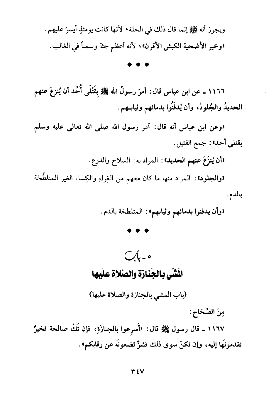 1166 - عن ابن عباس قال: أمرَ رسولُ الله - صلى الله عليه وسلم - بِقَتْلَى أُحُد أن يُنزعَ عنهم الحديدُ والجُلودُ، وأن يُدفَنُوا بدمائهم وثيابهم.
